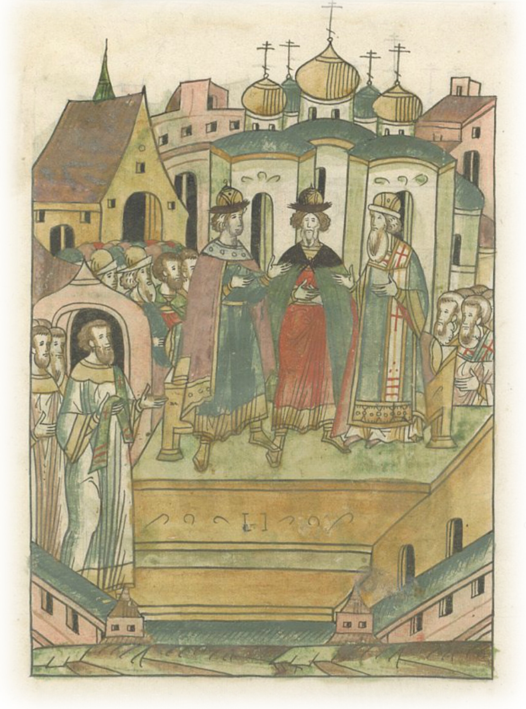 Возведение на престол внука великого князя Ивана Васильевича, князя Дмитрия Ивановича, в церкви Пречистой Богородицы в Москве.