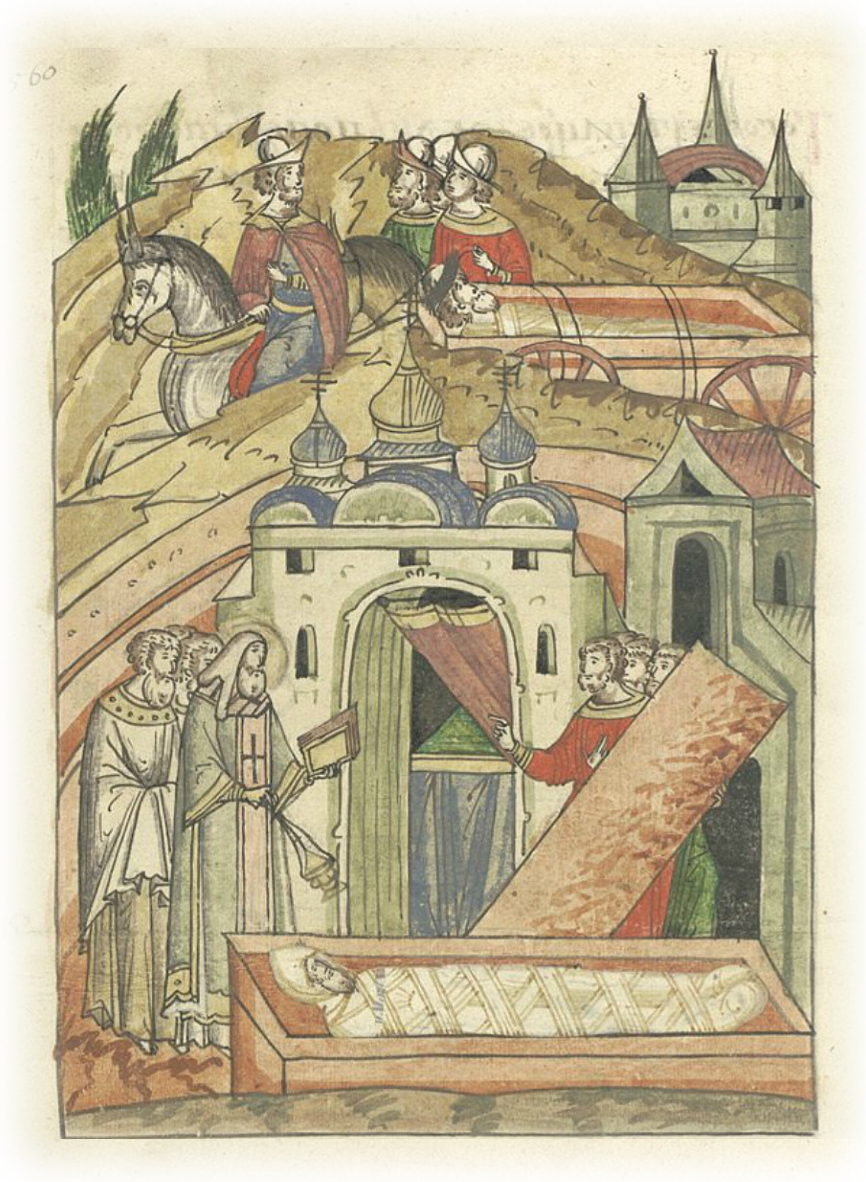 В том же году привезли из Орды тело великого князя Юрия Даниловича Московского, и похоронил его Петр митрополит в церкви святого архангела Михаила на Москве в первую субботу Поста.