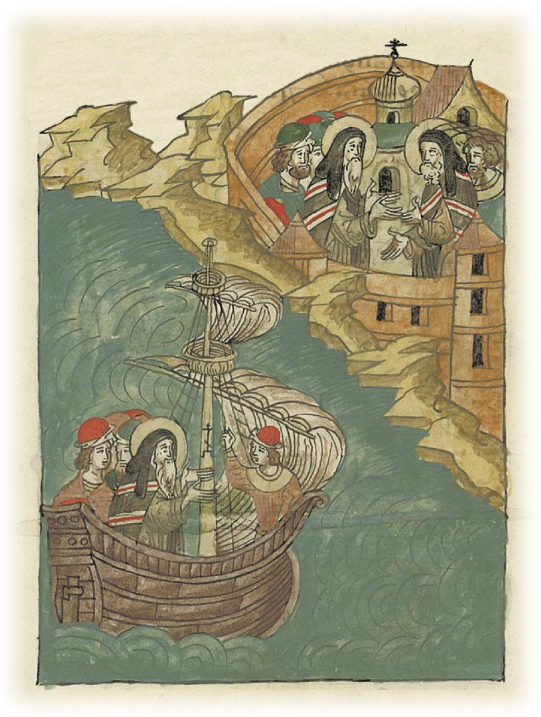 О Савве Сербском. Савва плывет на корабле с дарами от короля Владислава, его караулят разбойники, море волнуется очень сильно, грозя кораблекрушением, но святой молится и крестным знамением прекращает бурю. Он приплывает в Иерусалим, где его принимает пат