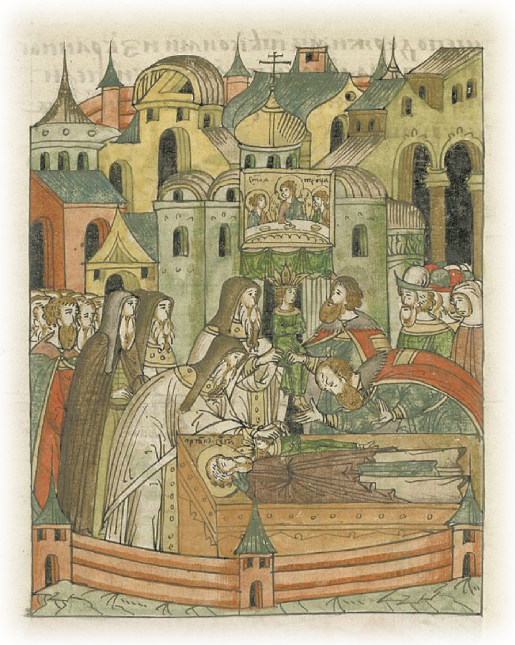 И после этого сам царь взял новопросвещенное чадо и положил его в честную раку на цельбоносные мощи святого Сергия, говоря благодарственные слова с обильными слезами и с молитвою, прилежно молясь так: «О, преподобный светильник, чудотворный Сергий! Ты отцам отец и с дерзновением предстоишь святой Троице, и ты молитвою твоею даровал мне сына, ты и соблюди его невредимым от всякого навета вражьего, видимого и невидимого. Ты осени его молитвами твоими святыми и храни его, преподобный, пока не повзрослеет; и тогда, Богом хранимый, он своими устами воздаст Богу и твоим молитвам похвалу и благодарение. Ведь я всегда к тебе прибегаю и все надежду мою на твое ходатайство возлагаю. Моли о нас святую Троицу единосущную, да подаст нам Тот, на кого надеемся!» И так закончив молитву, немного отступил от раки. Игумен же взял отрока от раки и со многим благоговением передал его на руки самодержавному отцу его, говоря: «Прими, о боголюбезный царь, Богом дарованное тебе чадо, поздним временем явившееся тебе, воспитай его в поучении закона Господнего и вашего царского благочиния; да будет сын твой по желанию твоему, как писано: сыновья твои были на месте отцов твоих, и поставили их князьями по всей земле, и помянуты были имена ваши из рода в род». И так царь взял свое новопросвещенное чадо как дар вожделенный, от Бога посланный на утешение души его, и надежду жизни своей, на укрепление великому царству своему и на радость всему христианству.