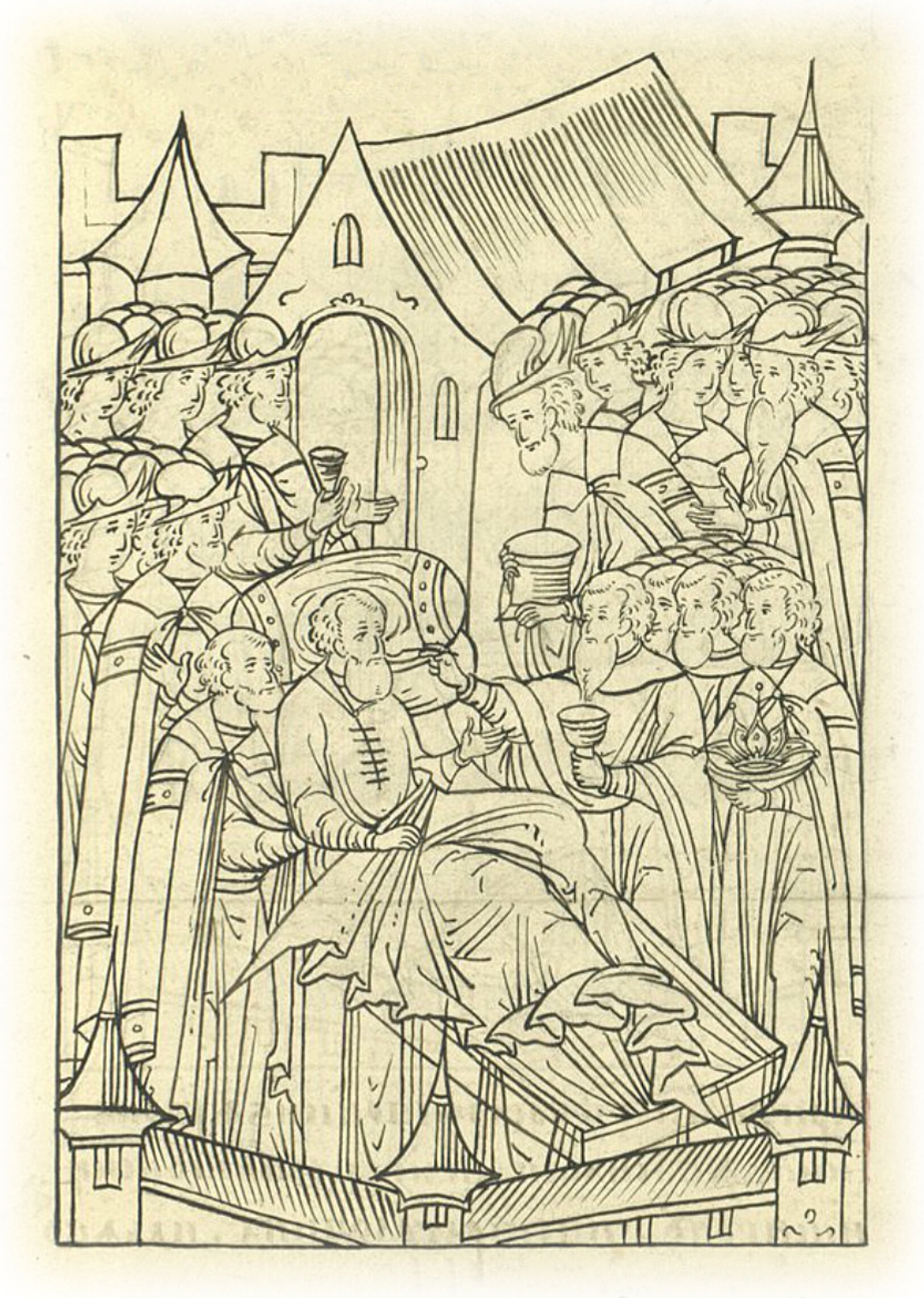 В среду же пришел к нему отец его духовный Алексей протопоп и принес к нему Святые Дары. Князь же великий не мог с постели встать, но под плечи подняли его, и причастился Святых Таин, и по причащении немного взвару* вкусил. * сусло, вскипяченное на меде.