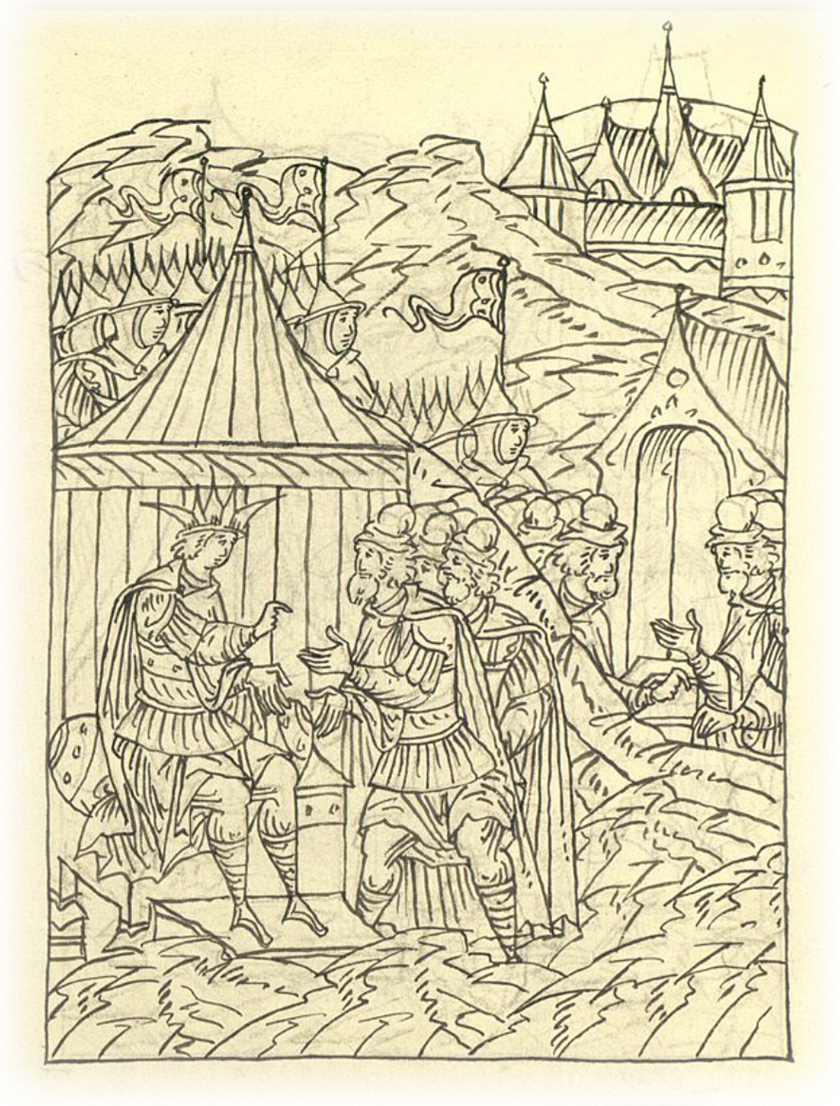 Языки говорят воеводам царя Ивана Васильевича, что магистр окопался большим рвом вокруг города Рындола, бьет из пушек и пищалей и приступает к Рындолу.