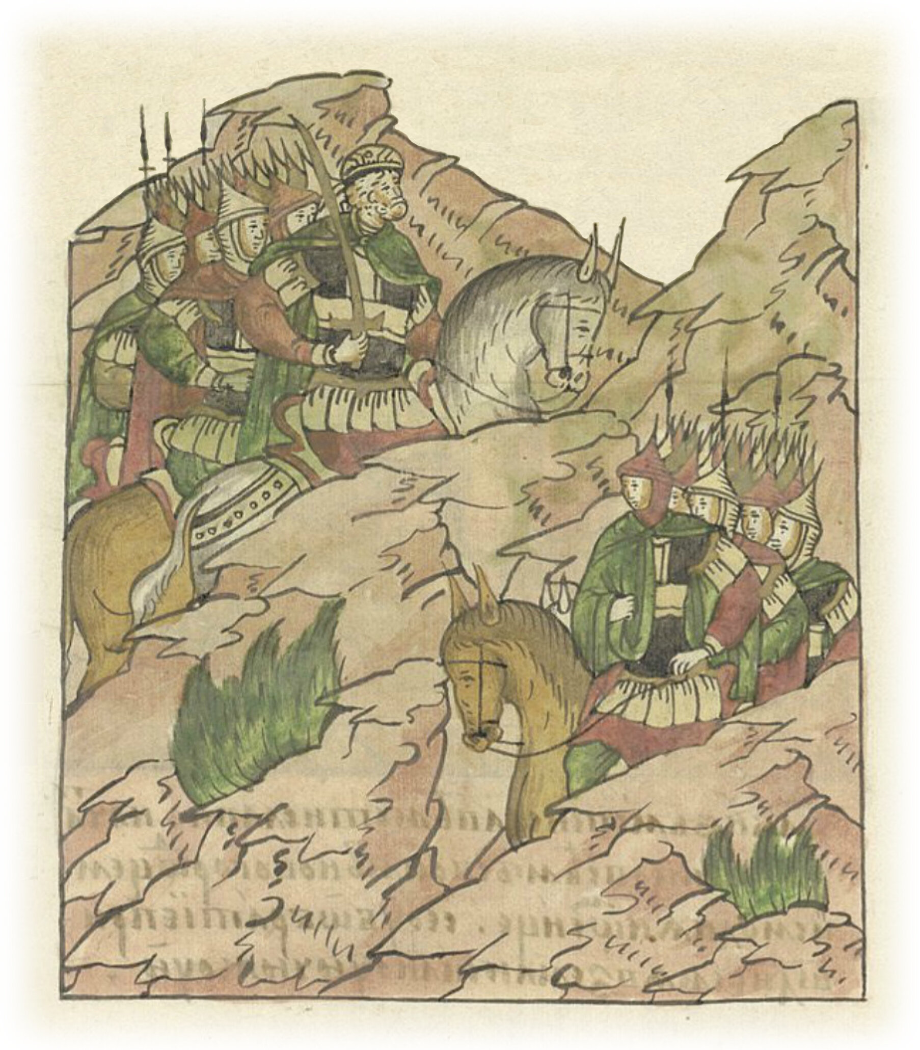 Воеводы царя Ивана Васильевича, разделившись, идут в погоню за царем Емгурчеем.