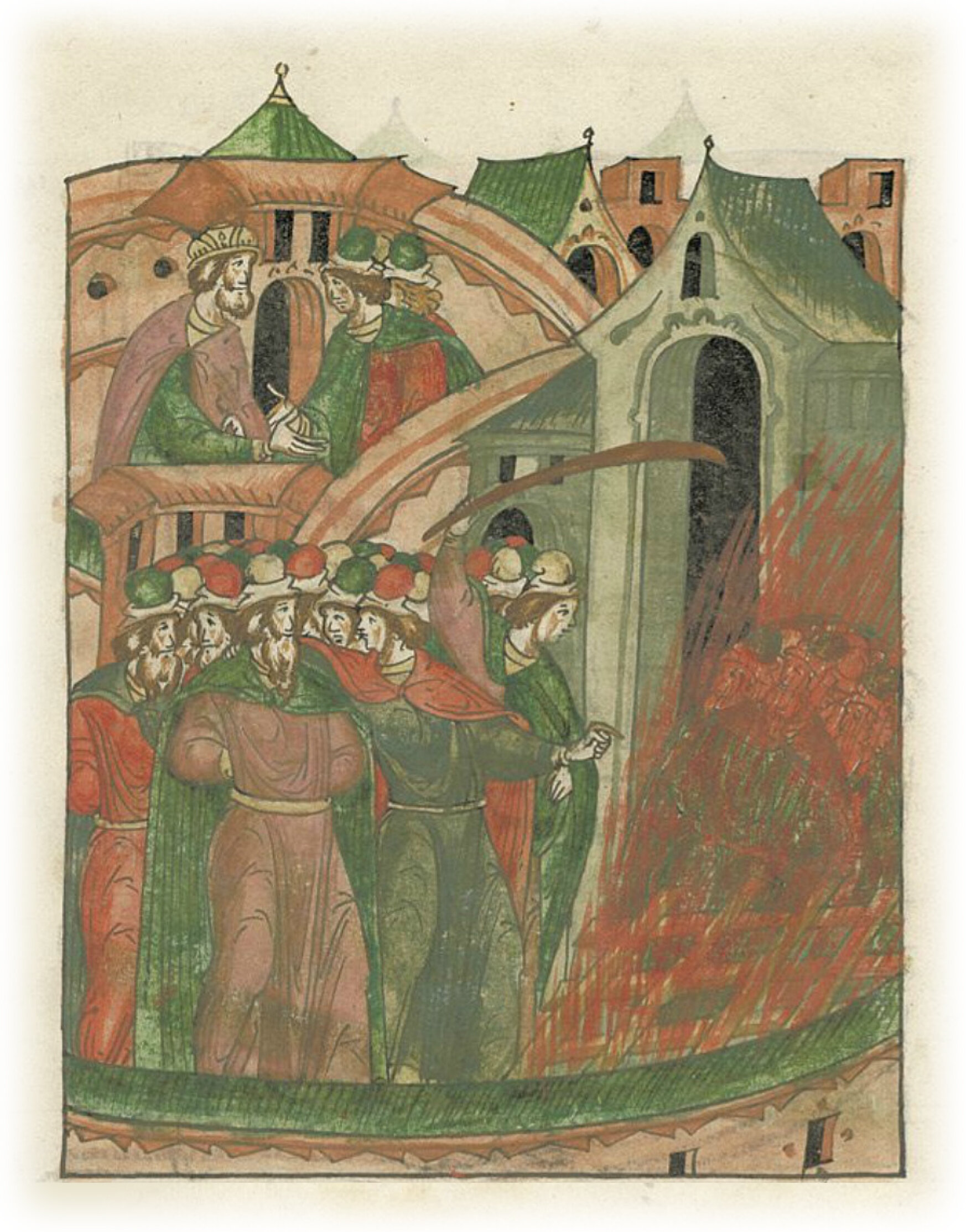 Новгородцы же повели волхвов на Ярославов двор, и, сложив большой костер на дворе Ярослава, связали волхвов всех и бросили в огонь; и там сгорели все.
