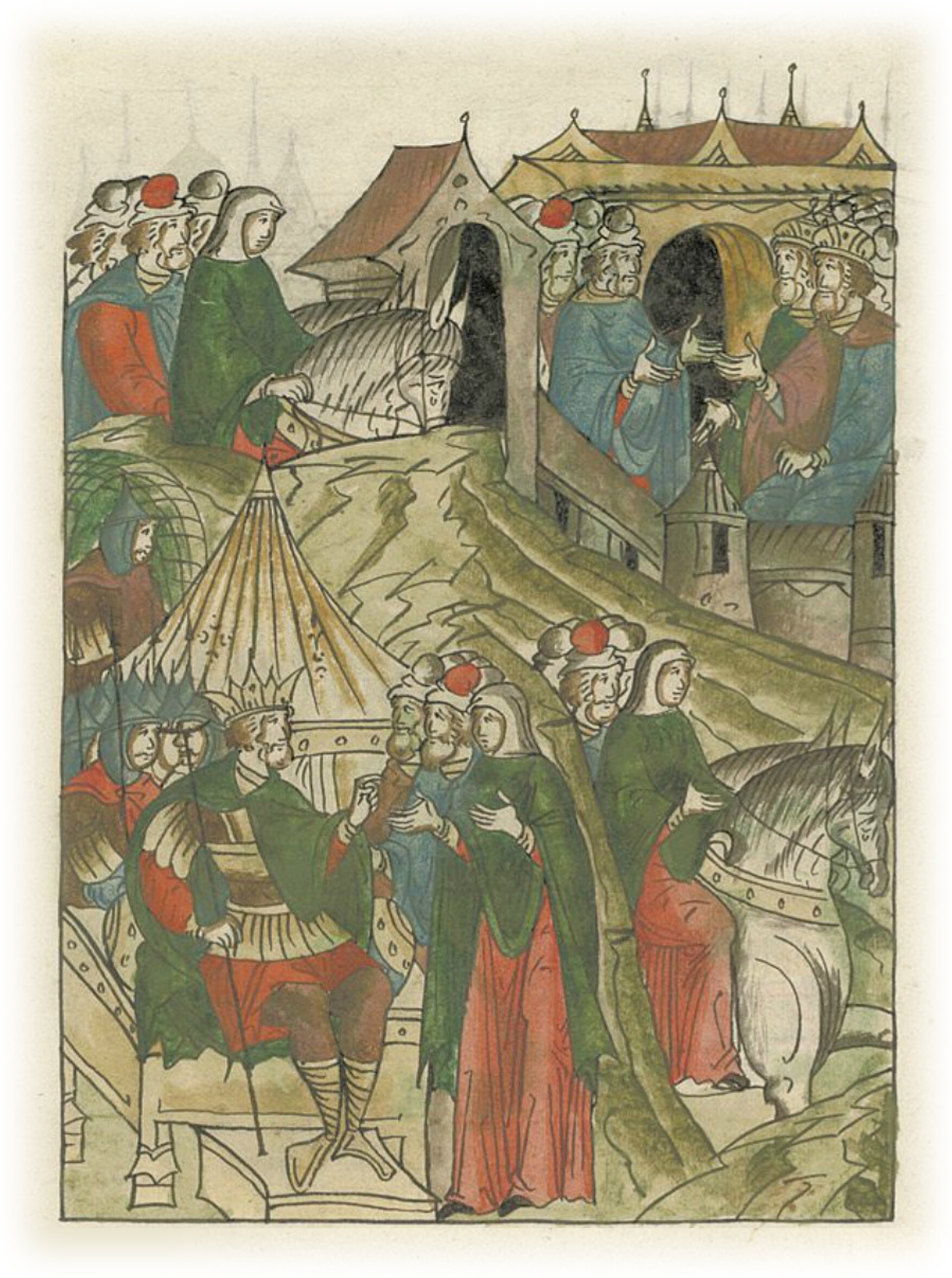 И оттуда послали послов своих, женщину-чародеицу и двух мужей с нею к князьям рязанским, прося у них десятину от всего: от князей, от людей, от доспехов и от коней.