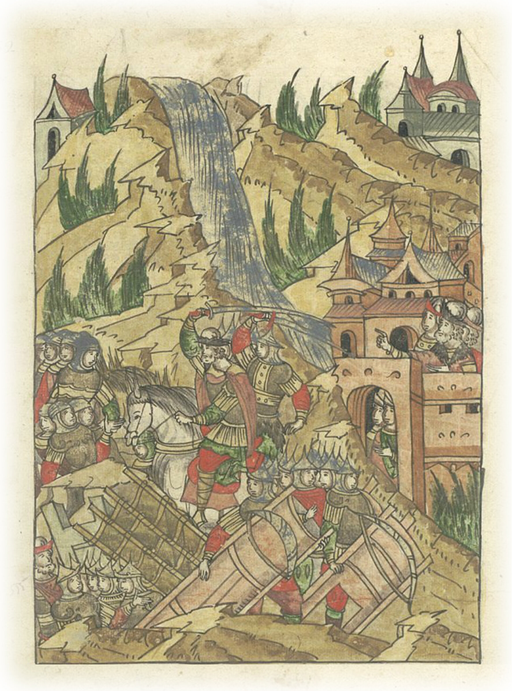 Языки говорят воеводам царя Ивана Васильевича, что магистр окопался большим рвом вокруг города Рындола, бьет из пушек и пищалей и приступает к Рындолу.