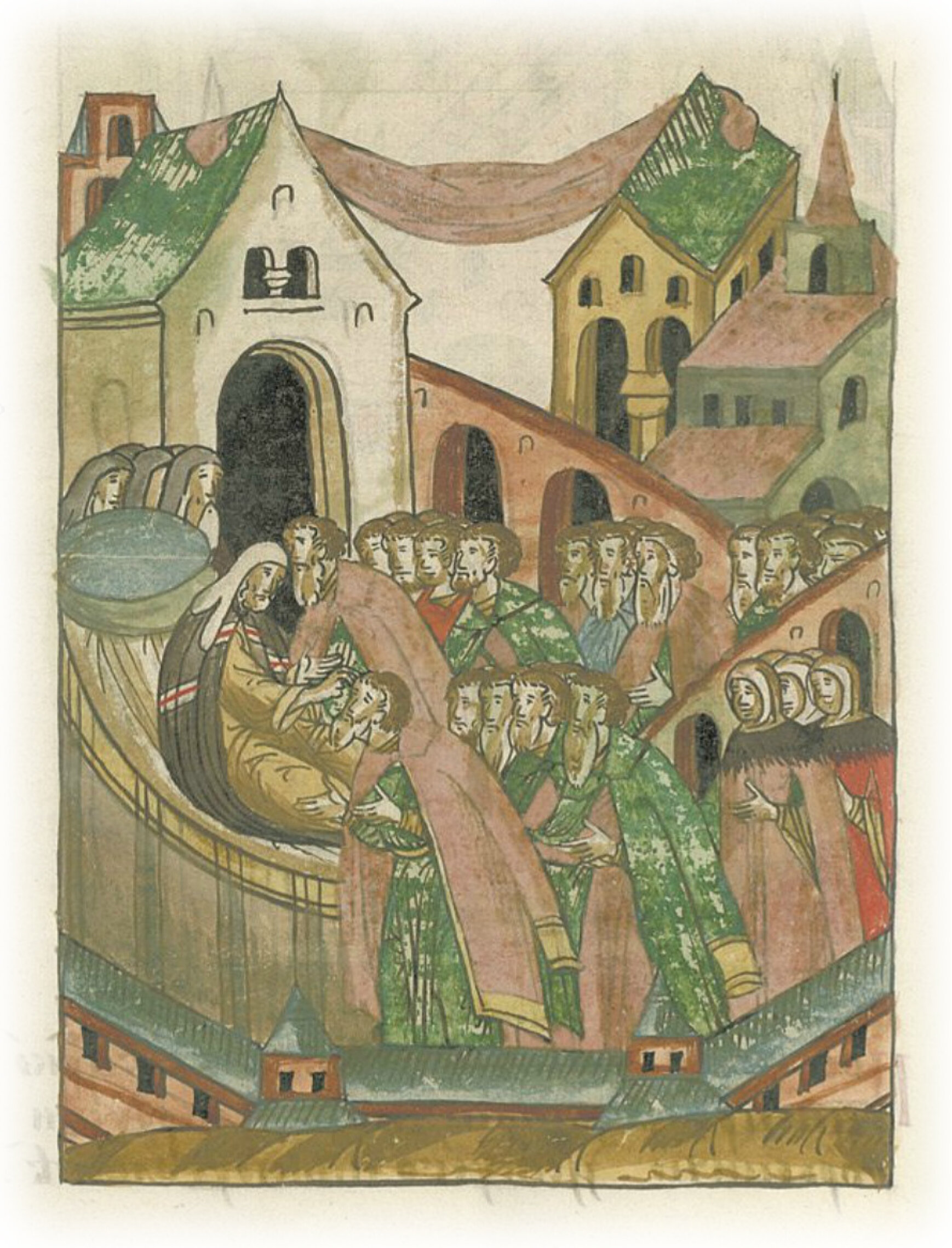 Всем же приходящим к нему князьям и княгиням, и боярам, и священникам, и всему православному христианству давая мир и благословение, и прощение, и последнее целование, а сам также у всех прощения просил; и так день тот прошел.
