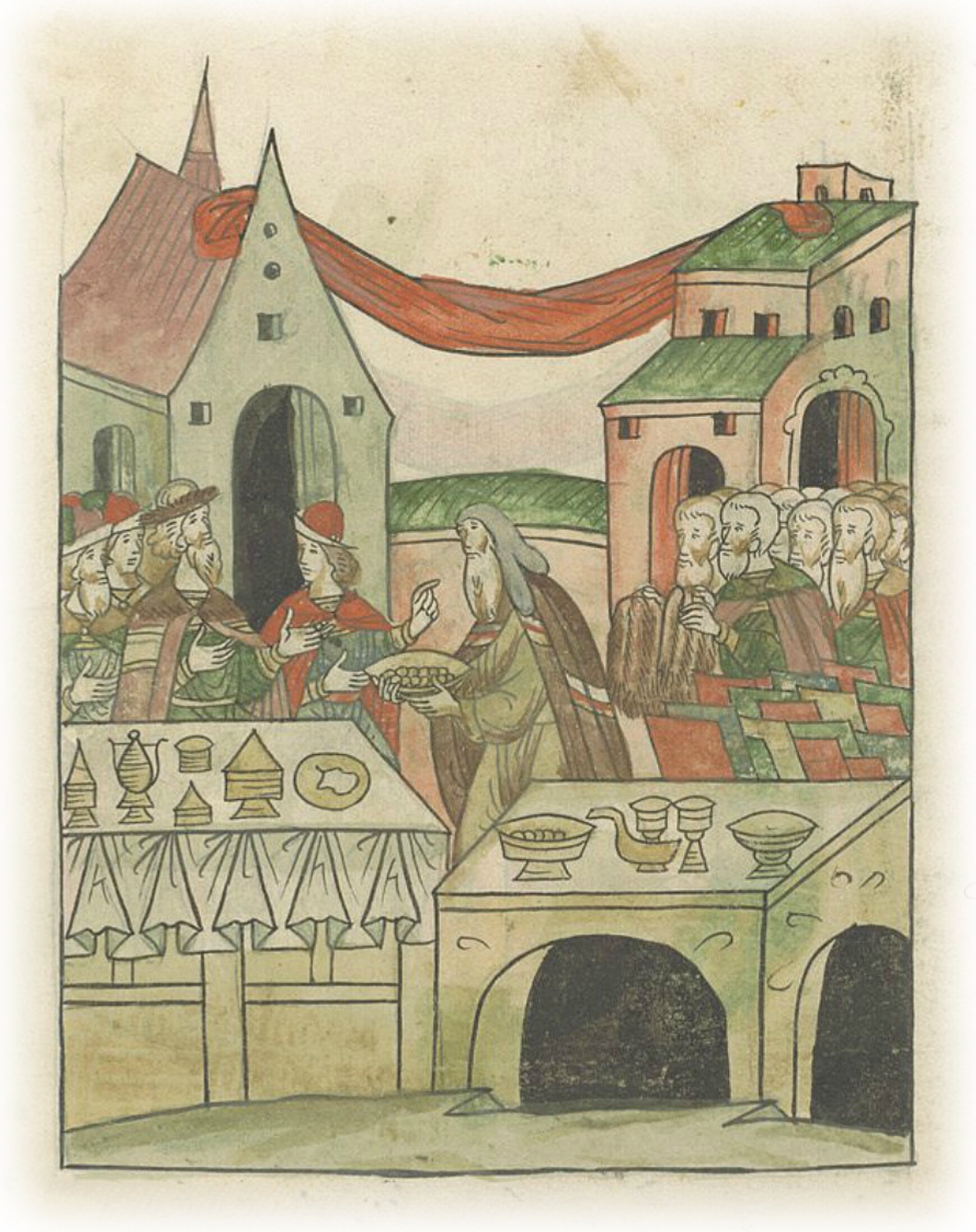 Месяца января в 19 день третий пир у архиепископа Феофила в честь великого князя был; даров: 1.000 золотых венгерских и венецианских, да 300 кораблеников золотых, да ковш золотой с жемчугами (весом в) три гривенки, да два рога турьих, окованных золотом, да чаша серебряная (весом в) 12 гривенок, да 18 поставов фландрского сукна разных цветов, да 10 сороков соболей.