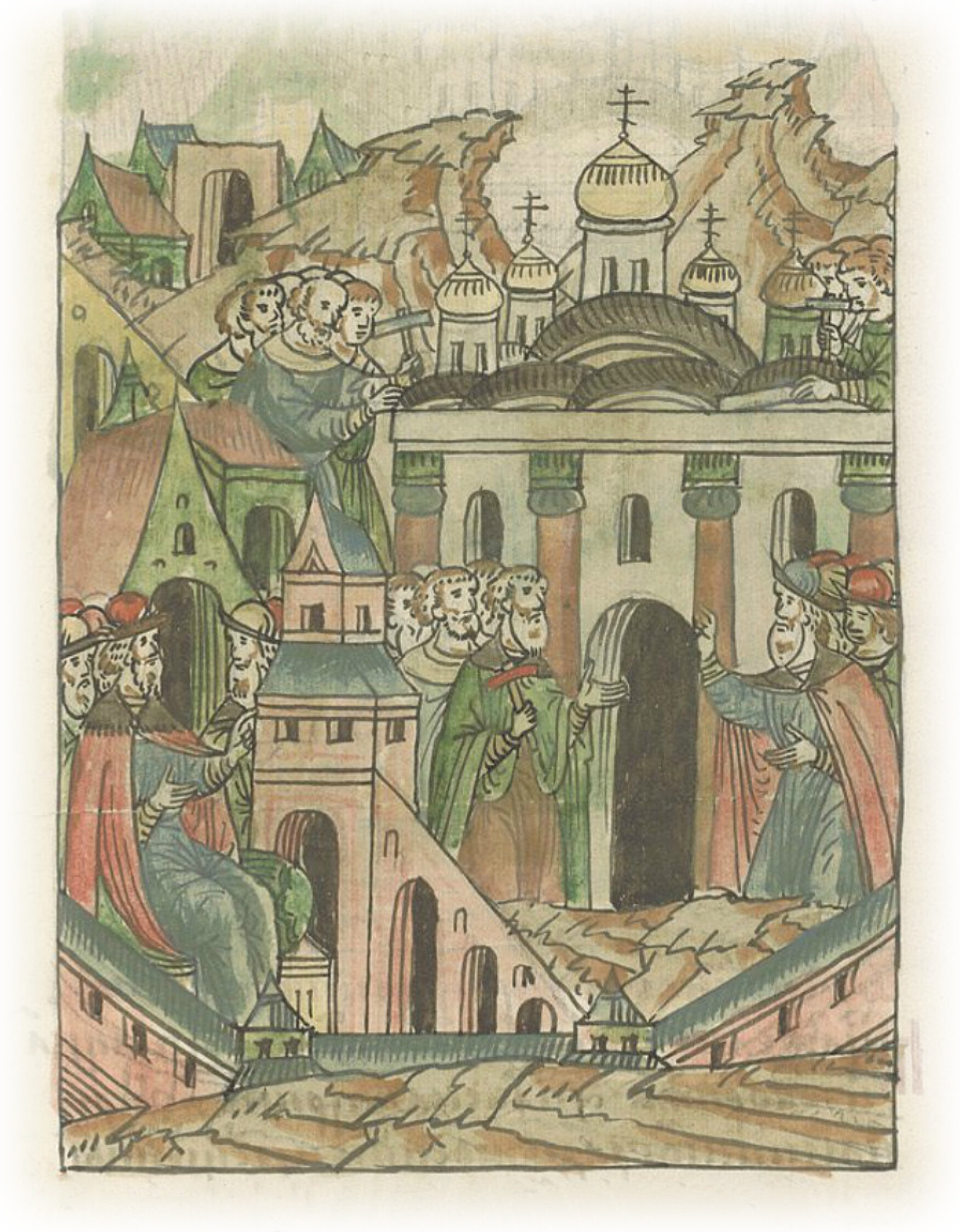 И повелел князь великий ее крыть новгородским мастерам; мастера же начали ее крыть сначала деревом очень хорошо, а по дереву – железом немецким.