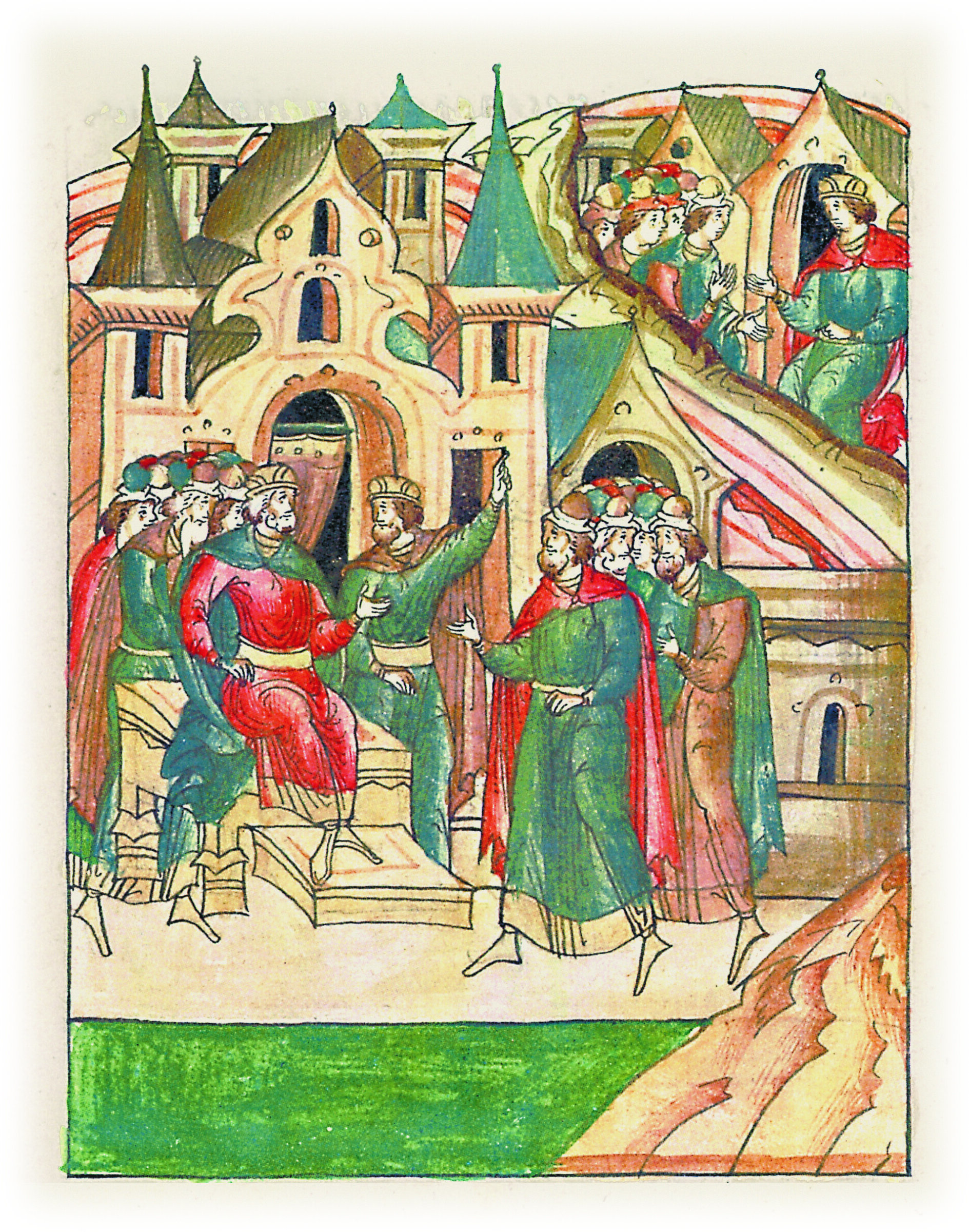 Великий князь Изяслав Мстиславич со Святославом Всеволодовичем размышляют, идти ли ратью на князя Святослава Олеговича.