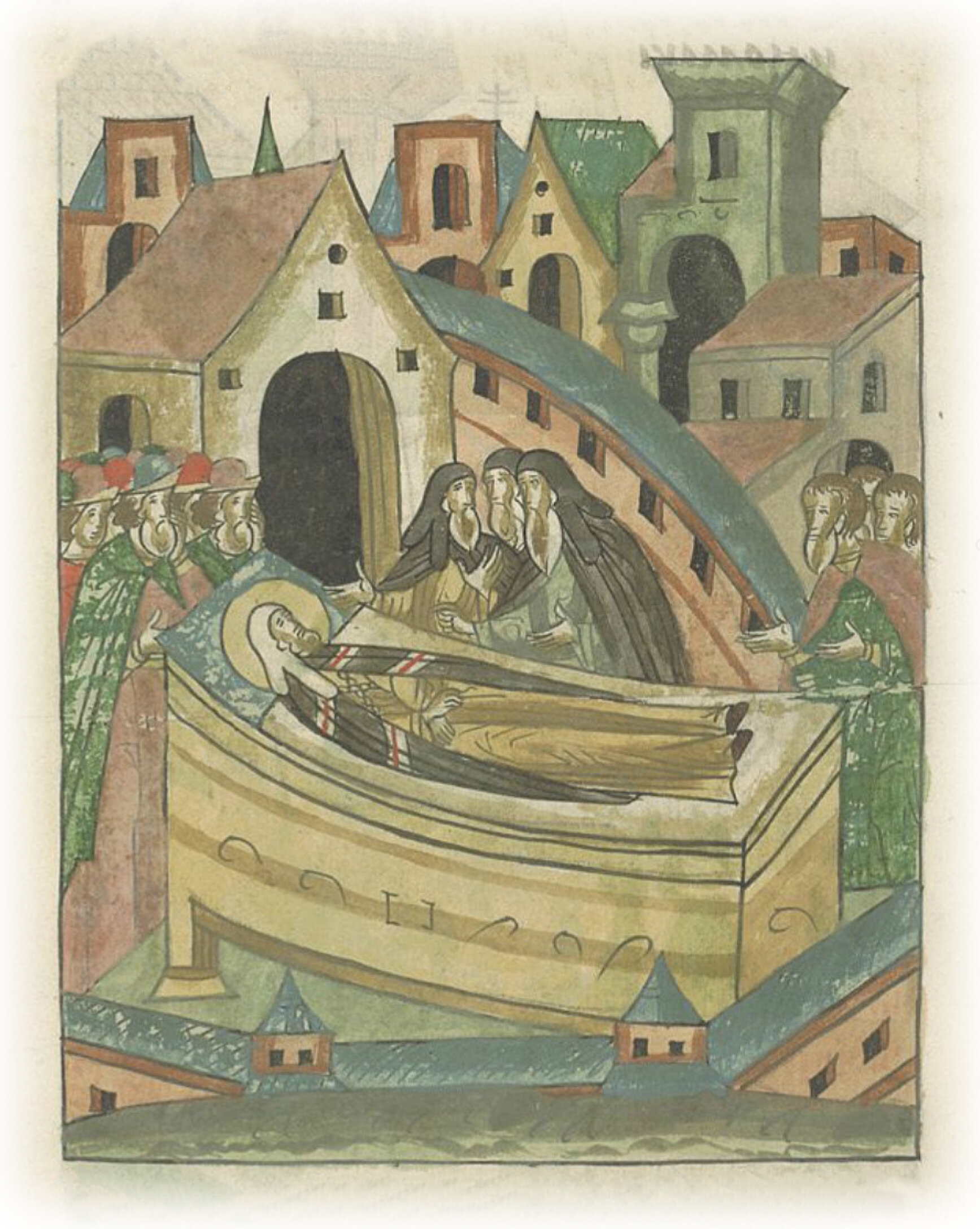 А в 5 день апреля, той же ночью, когда заканчивался первый час ночи, отошел к Богу. Многие же о том говорили, что видение видели в церкви. По кончине же его нашли под свиткой на теле его великие цепи железные, которые и ныне можно видеть на гробе его; а прежде того ни духовнику его, ни келейнику неведомы были, и никому другому.