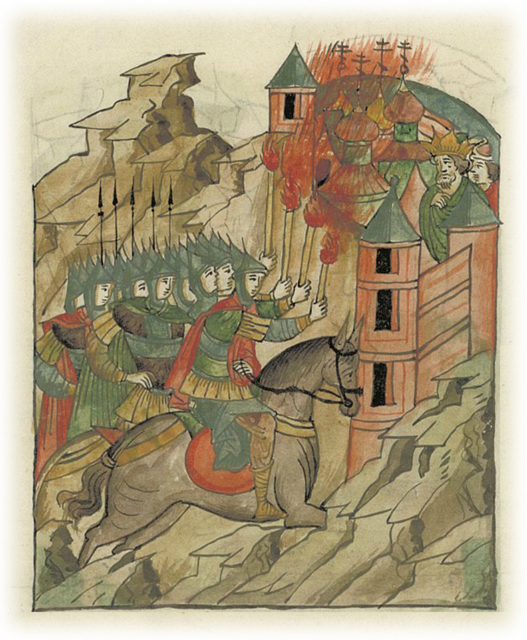 и приступили к городу, в четырех местах поджегши храмы. И тогда царь Алексей увидел огонь, не вышел на битву с ними,