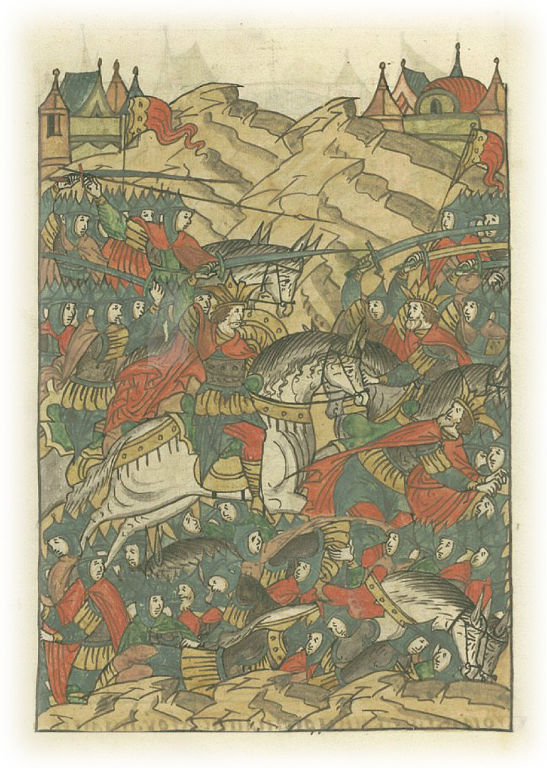 В ту же осень была битва между царем Тохтамышем и царем Аксак-Темиром. И царь Тохтамыш был побежден, и его многочисленное воинство было перебито царем Аксак-Темиром.