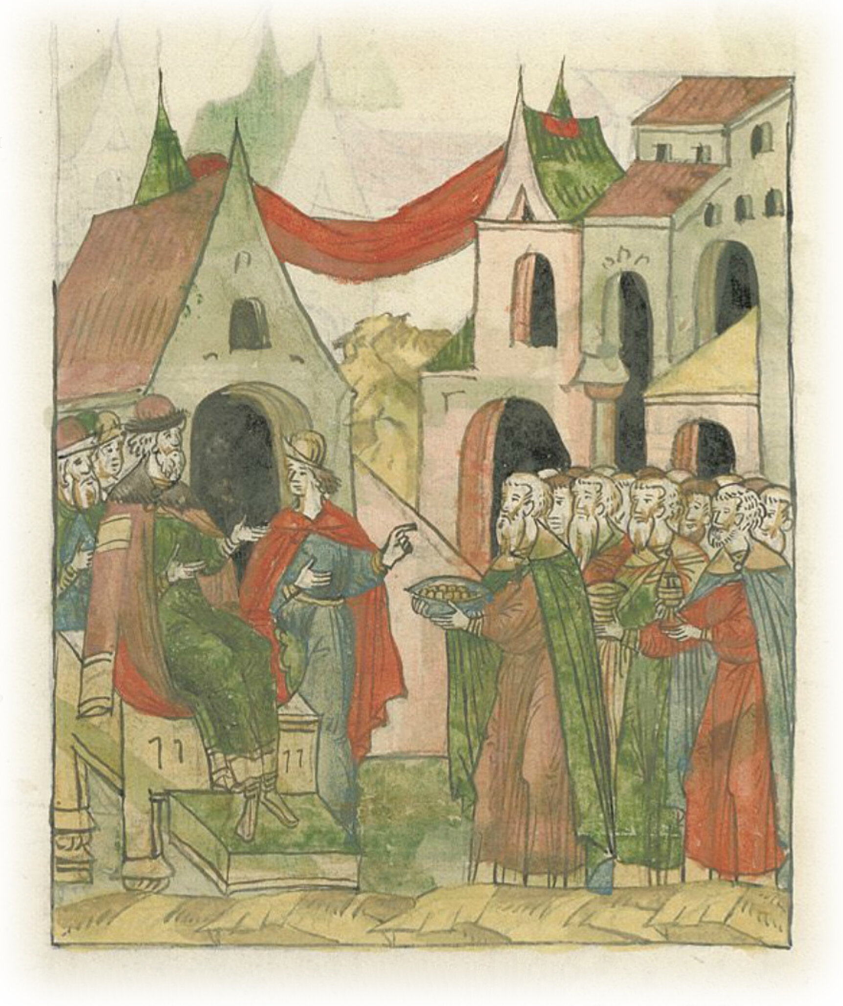 А все они с дарами приходили бить челом великому князю, которые они на пирах хотели подарить великому князю, также и купцы, и зажиточные горожане лучшие все. Никого не осталось, кто бы не пришел с дарами, даже молодые люди с подарками многими у него с челобитьем были.