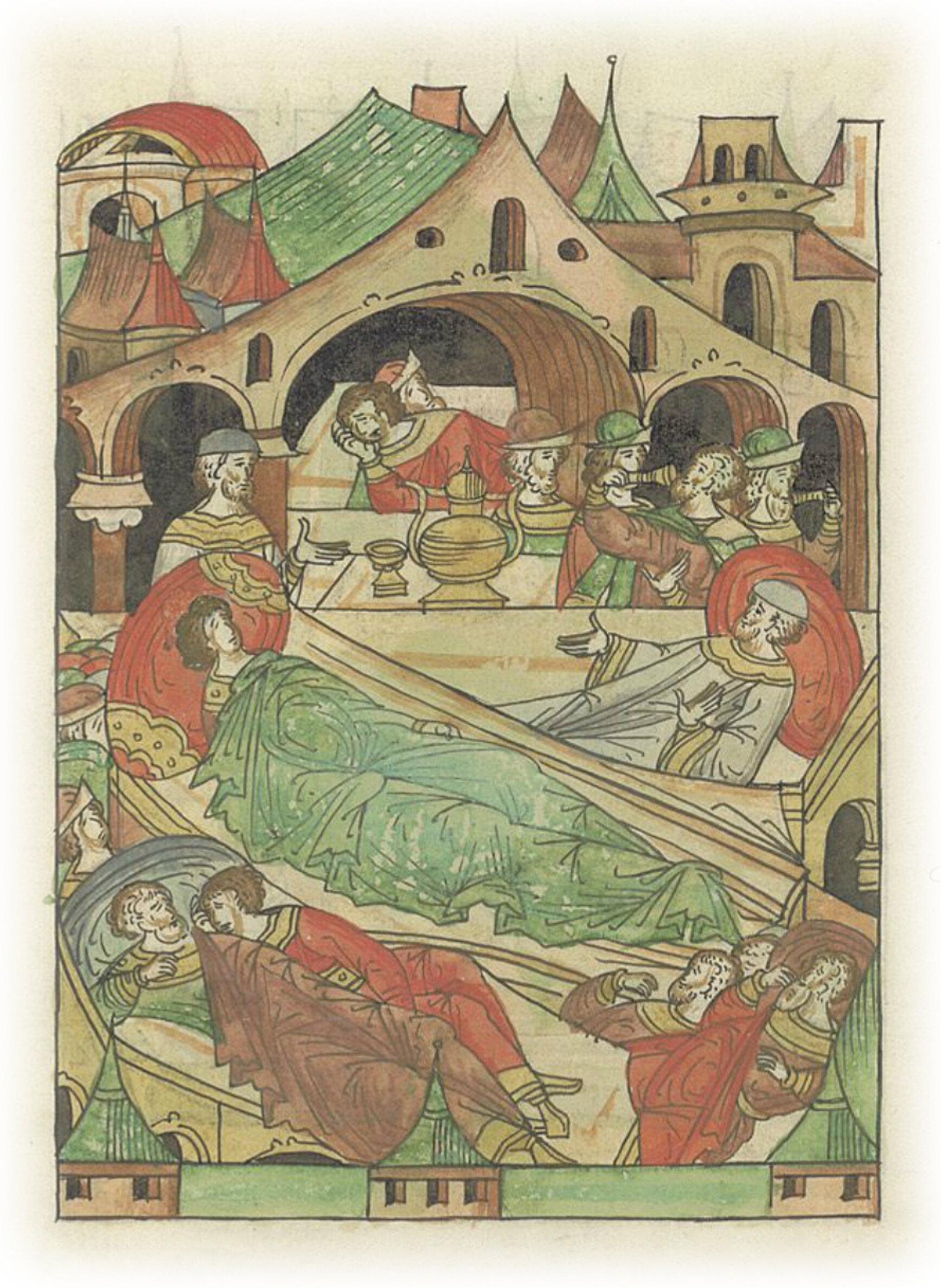 И потом, выпив немного меду, в той же горнице около князя легли многие и заснули, один только его дьякон не выпил тогда, но лег напротив тела князя на другой лавке, смотрел на него, а спать ему не хотелось.