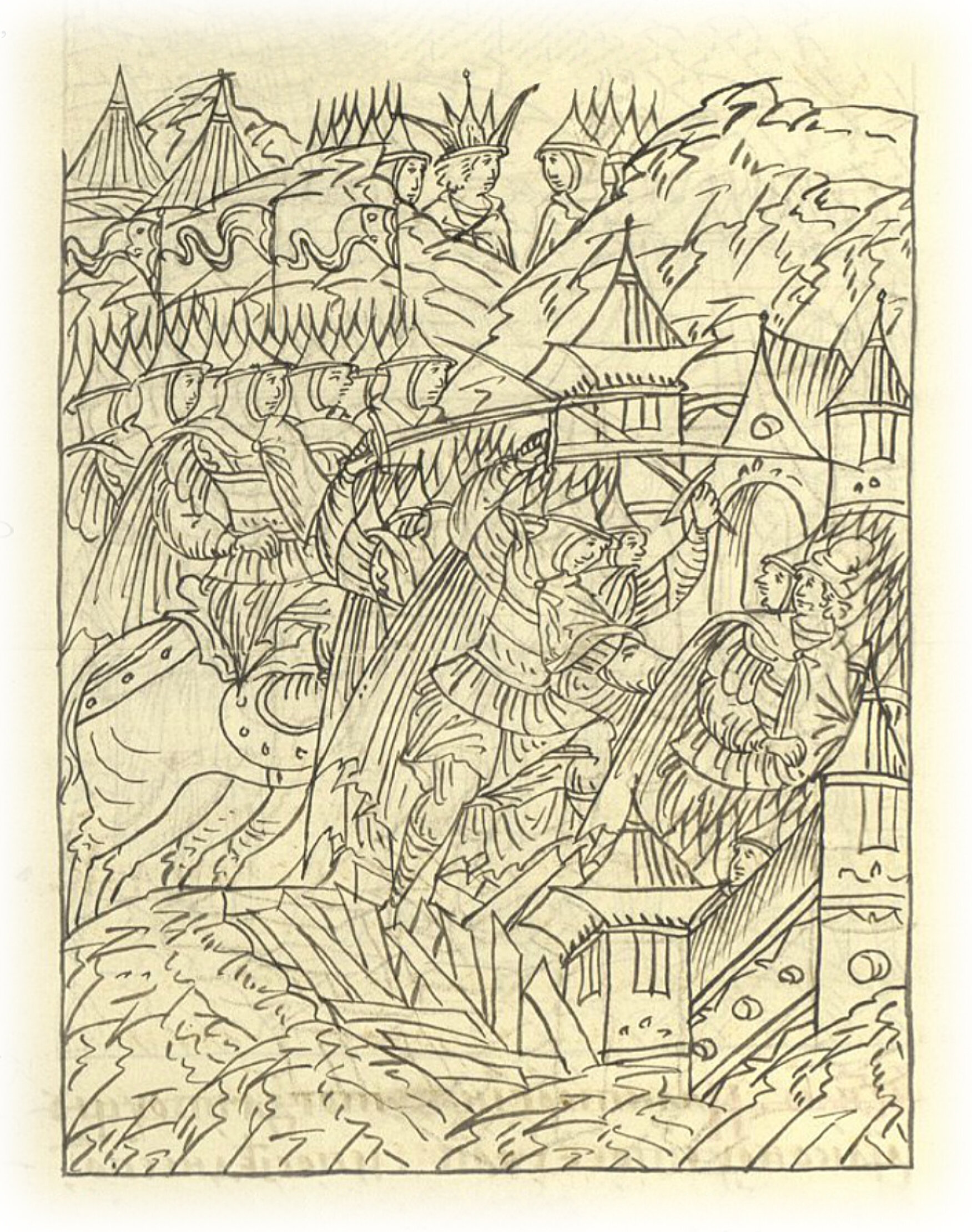 Многое же воинство с крестоносными хоругвями, Богом вдохновляемое, дерзновенно, словно облаками носимые, скороустремительно на городские стены и в самый город поскакали и, как львы рыкая, свирепо безбожных татар убивали и живых бесчисленно пленяли.