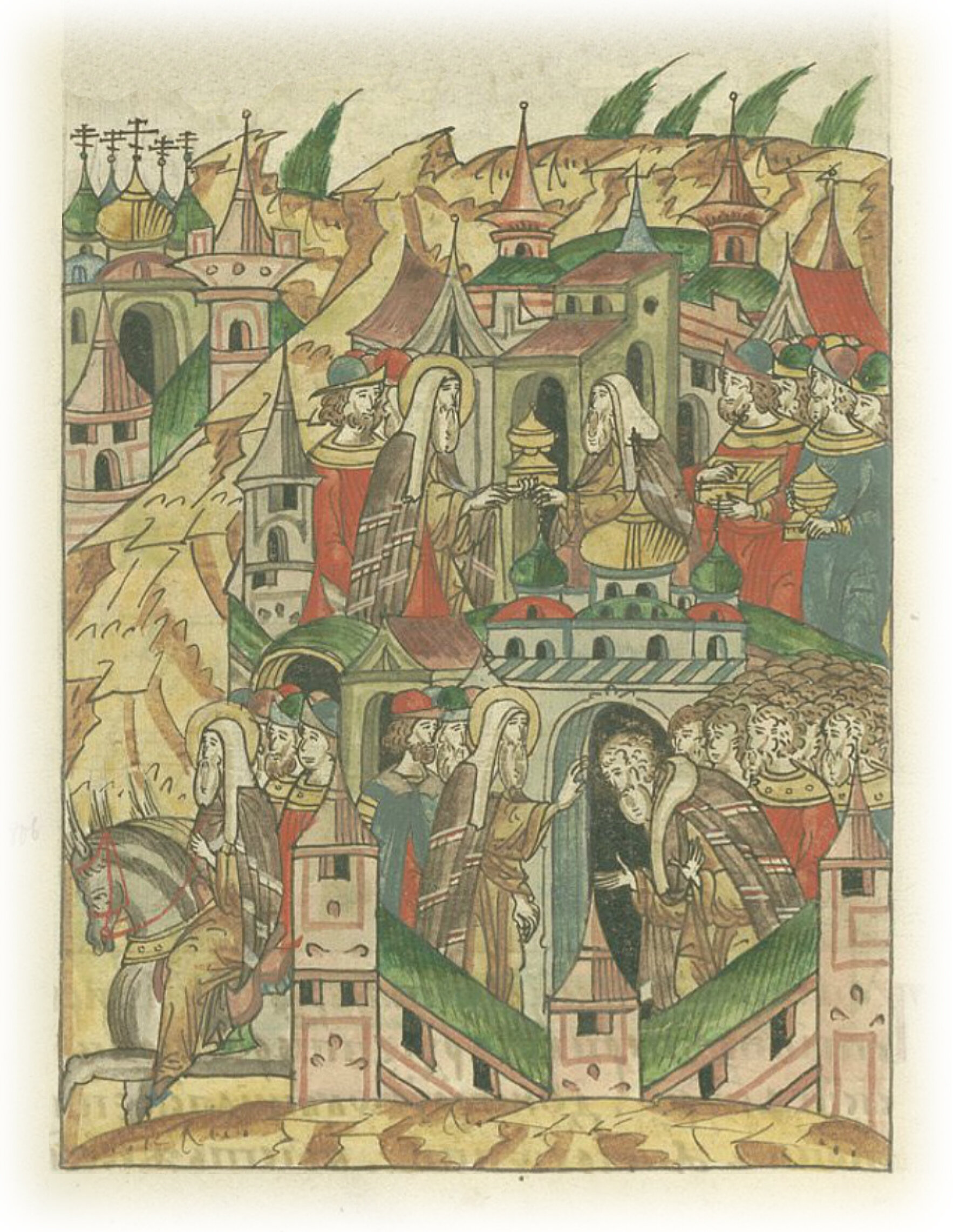 Митрополит Киприан, уходя из Новгорода в Москву, благословляет Новгородского владыку Ивана и весь город.