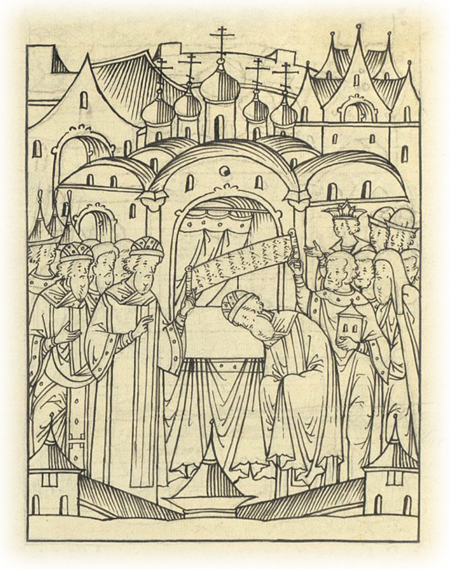 О поставлении архиепископа. Той же весной 18-го июня, в неделю вторую Петрова поста, поставлен Макарием митрополитом архиепископ Феодосий Великому Новгороду и Пскову, архимандрит Юрьева монастыря Великого же Новгорода.