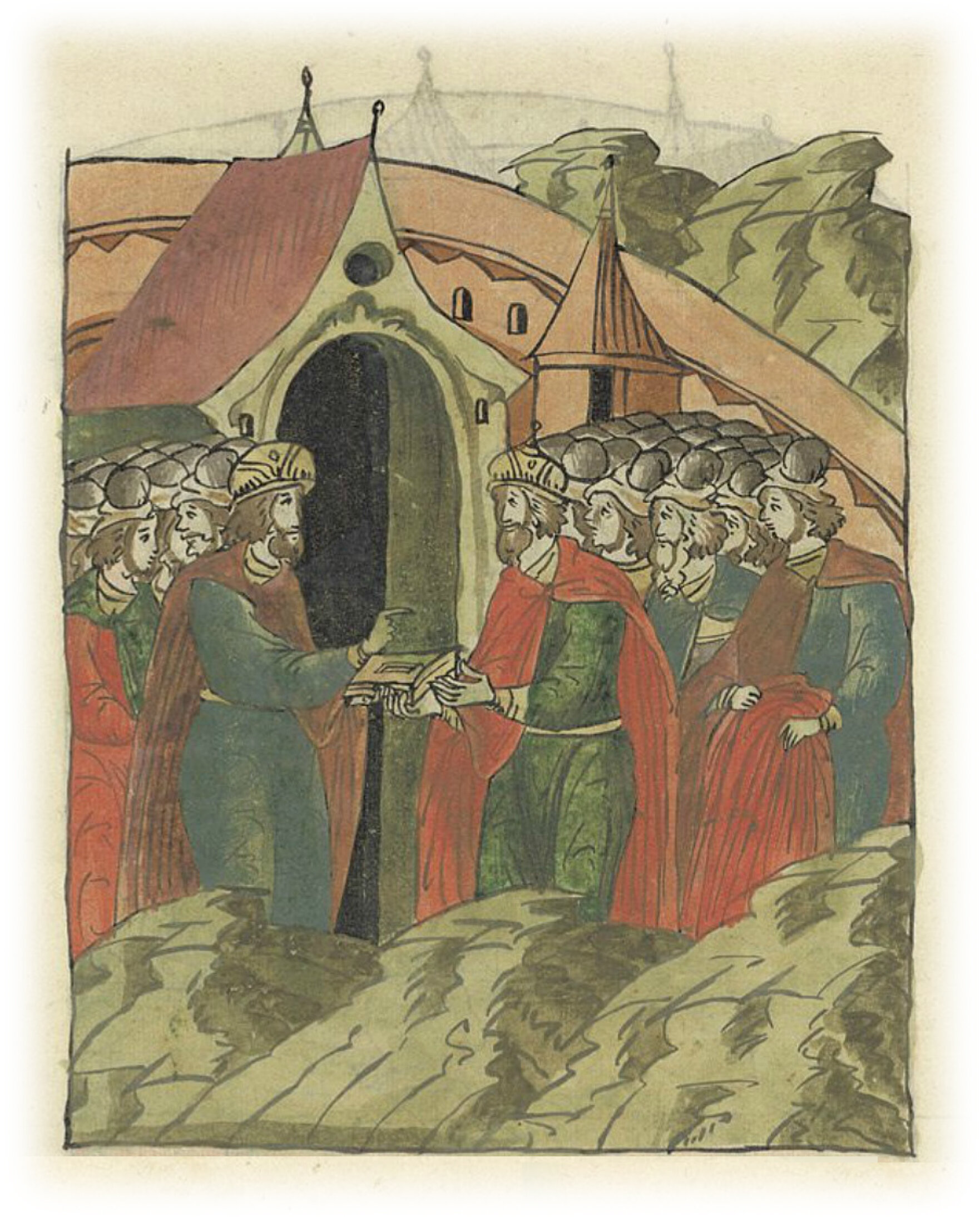 И устроил великий князь Юрий встречу брату своему Святославу и всем воинам на три дня, и многие дары дал брату своему: золотом, и серебром, и одеждами различными, конями, и оружием, драгоценными камнями и шитьем, (одарил) также и воинов, каждого по достоинству.
