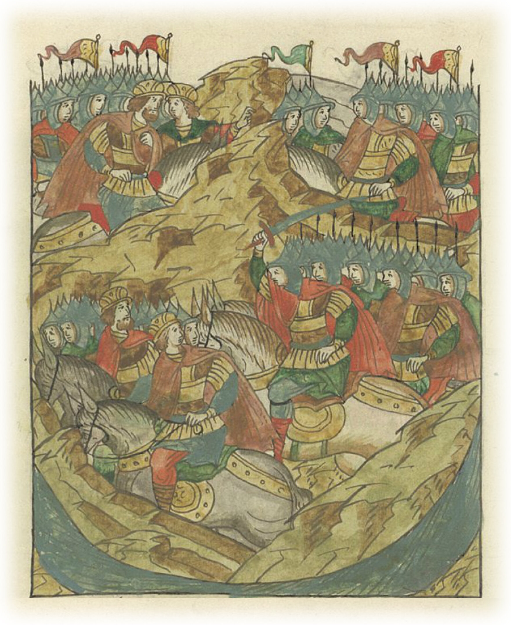 Подошли все созванные половцы к сражающейся дружине, собралось их великое множество. Олеговичи же, увидев их, ужаснулись и от своего замысла отказались, так как уже изнемогли, от отсутствия воды и сами страдали, и их кони, и смогли подойти немного к воде, так как уже 3 дня не пускали их половцы к воде; тогда половцы устремились на них и притиснули к воде.
