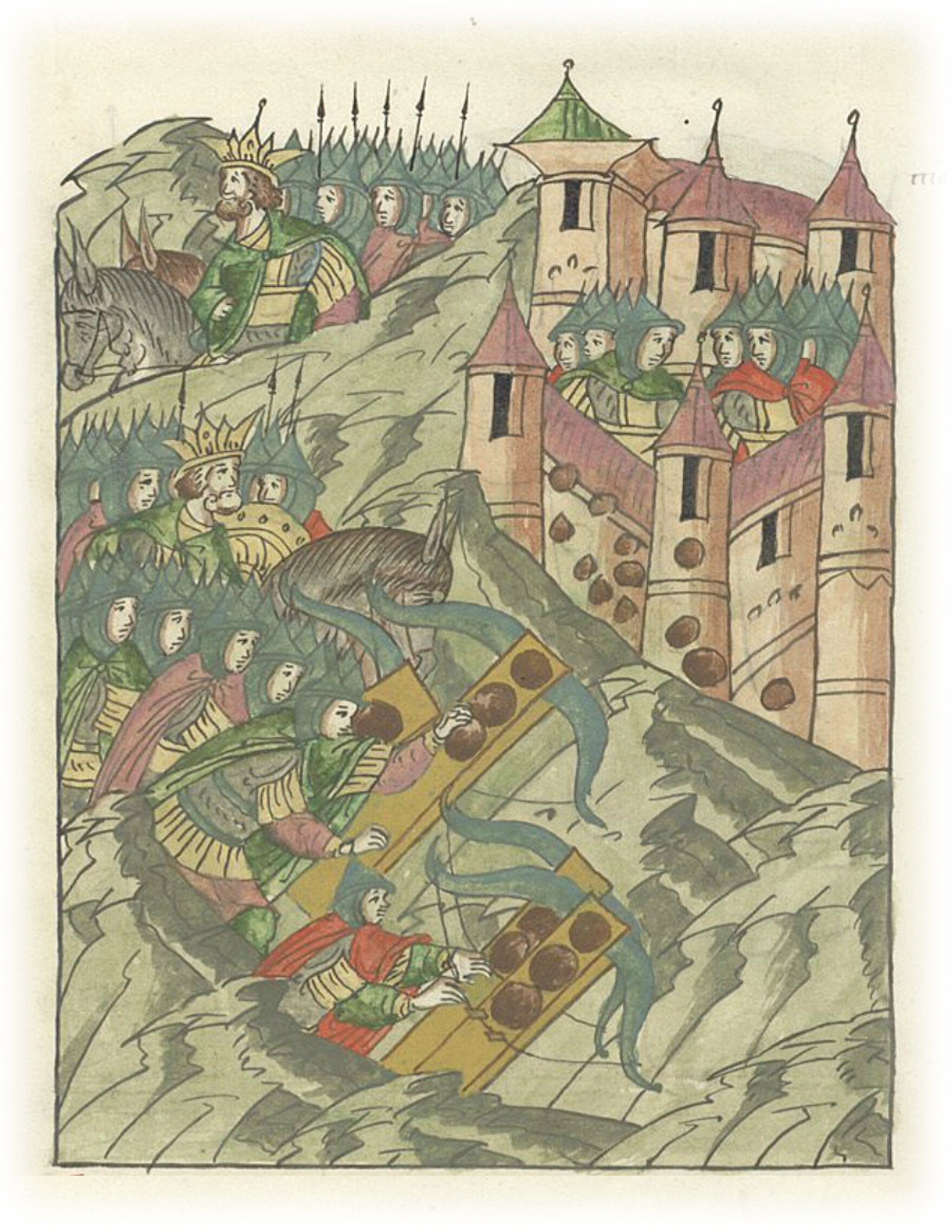 Языки говорят воеводам царя Ивана Васильевича, что магистр окопался большим рвом вокруг города Рындола, бьет из пушек и пищалей и приступает к Рындолу.