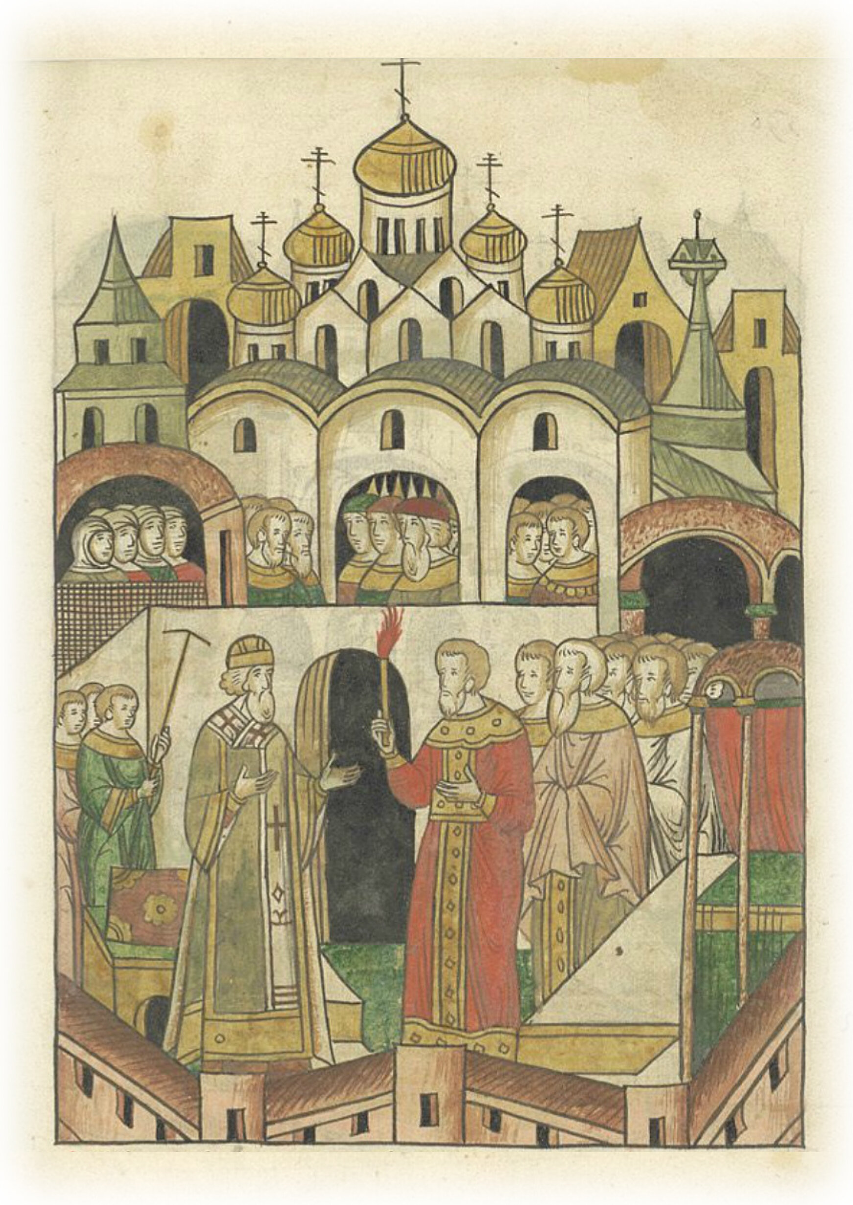 И пошел царь на выход, свечу в руке держа. Антоний же патриарх стоял на своем месте посреди церкви.
