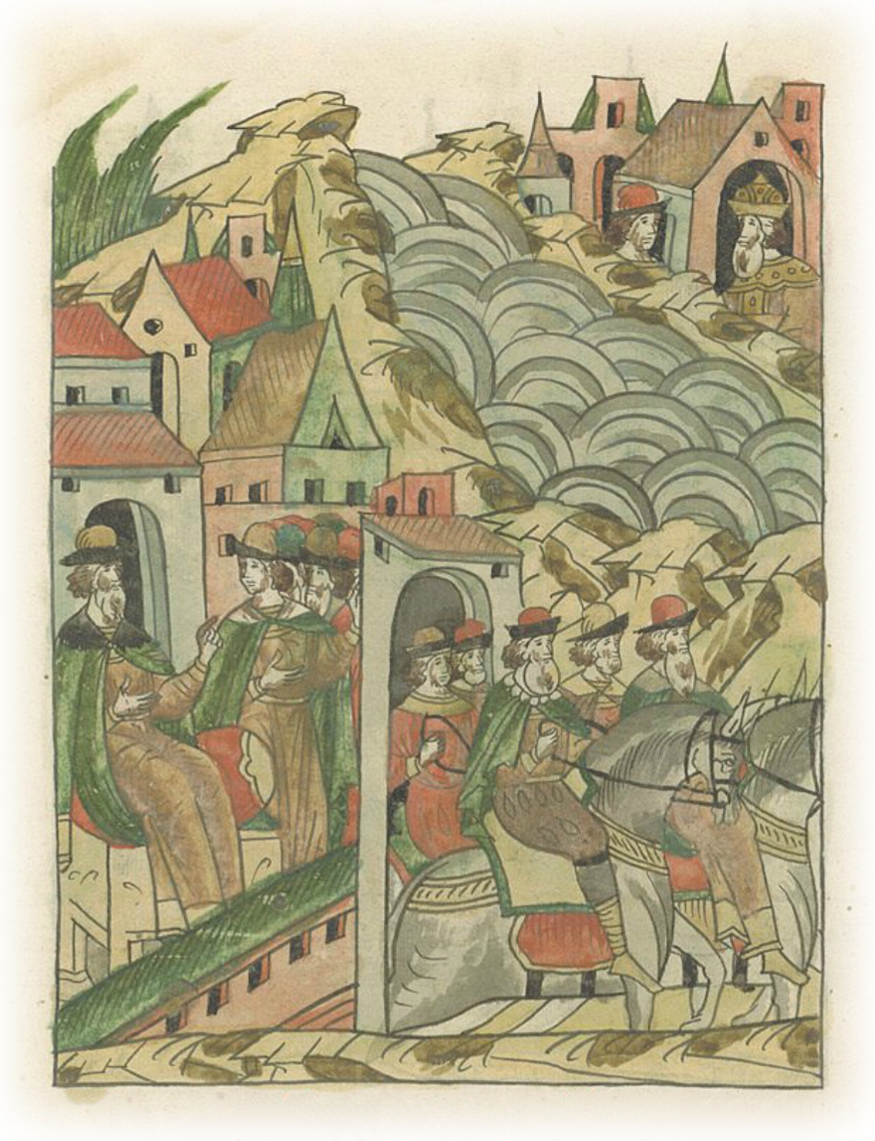 Великий князь Иван Васильевич отпускает посла Римского короля Максимилиана Юрия Делатора вместе со своими послами для заключения мирного договора.