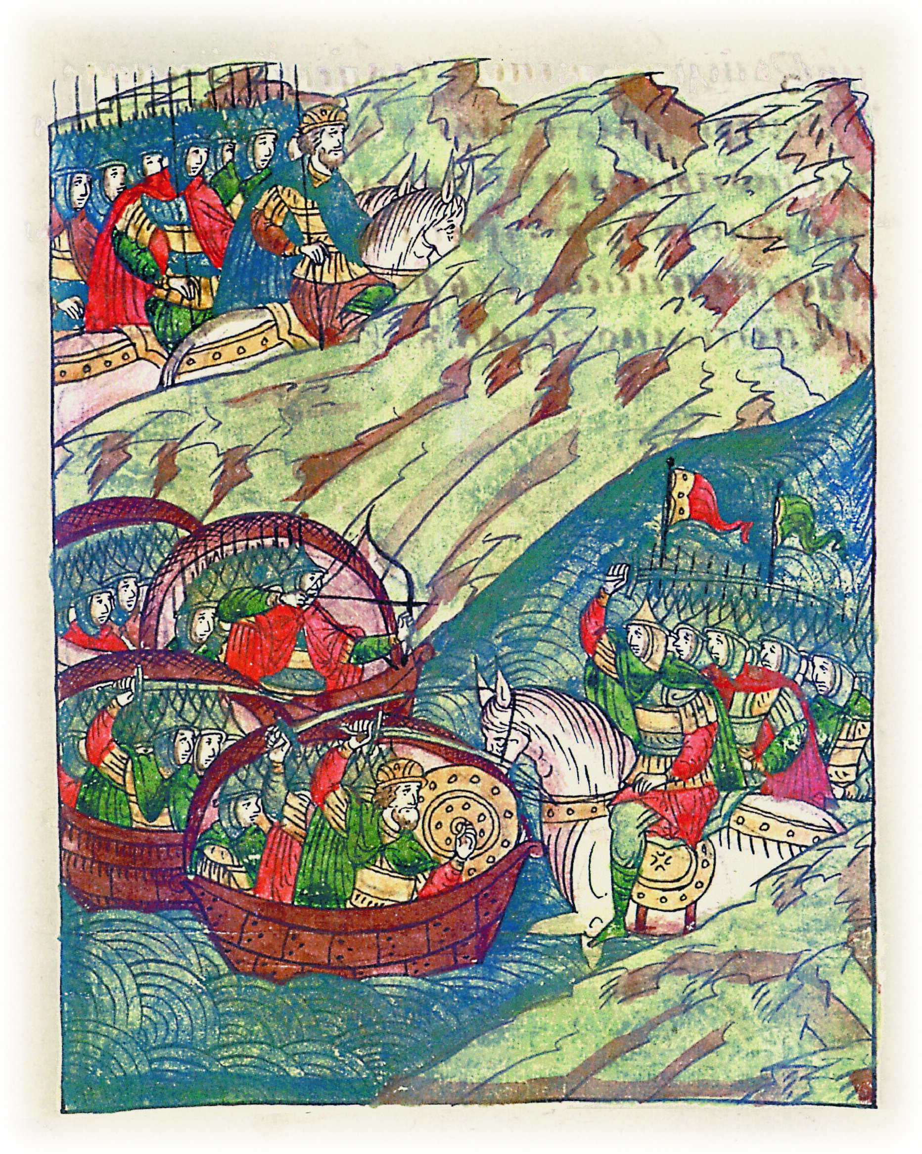 а князь великий Киевский Изяслав Мстиславич шел по этой стороне реки Днепра по горе, а ладьи его шли по Днепру. Придя к Витечеву броду, встали напротив, и была битва злая, и киевские ладейники одолевали супротивных. И великий князь Киевский Изяслав Мстиславич сам мужественно бился с ними, не давая переправиться им через Днепр.