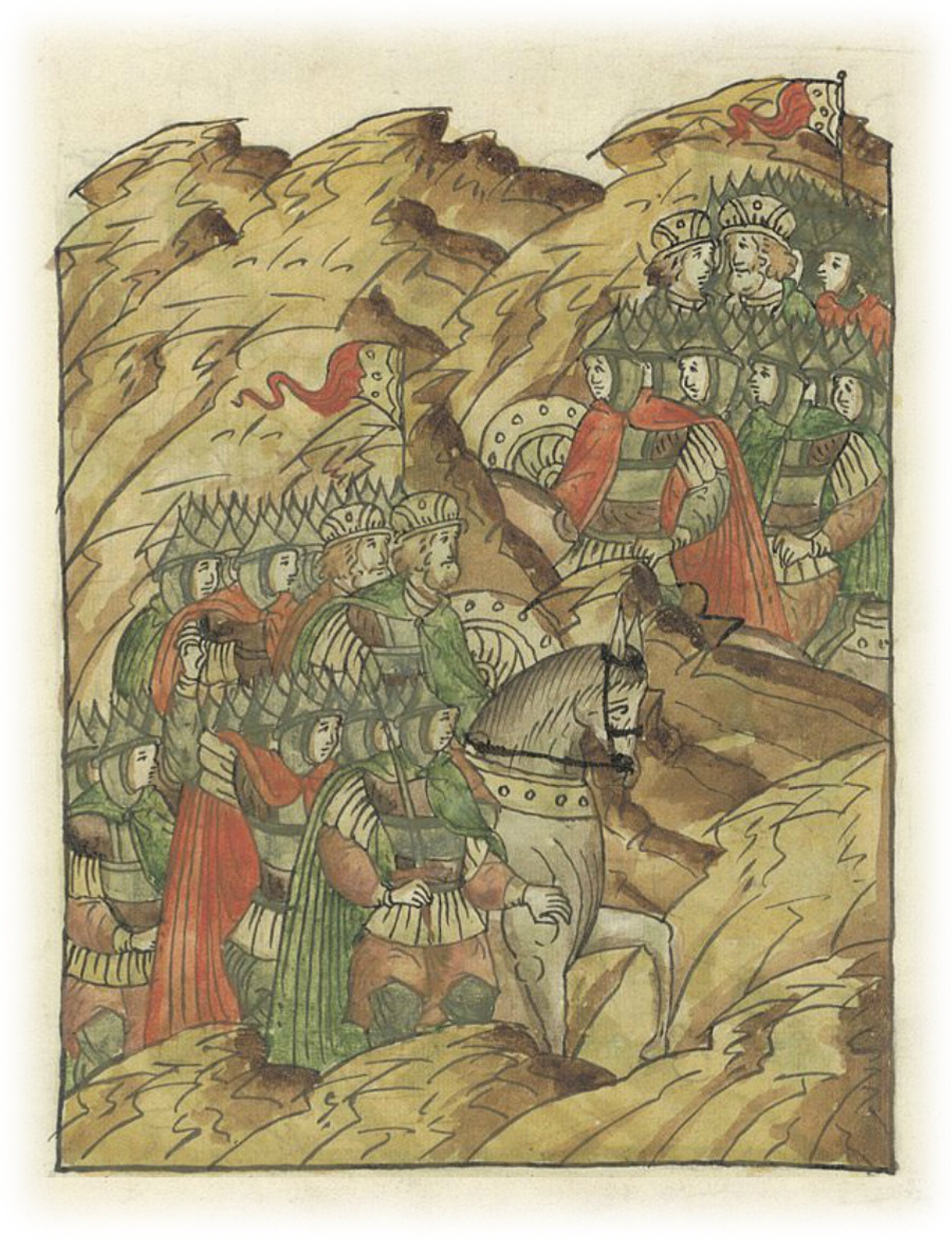 О побоище князя Ярослава Всеволодовича с князем Новгородским Мстиславом Мстиславичем у Липицы. Князья Владимир Рюрикович Смоленский, Всеволод Мстиславич и Владимир Псковский идут с полками сквозь пеших воинов.