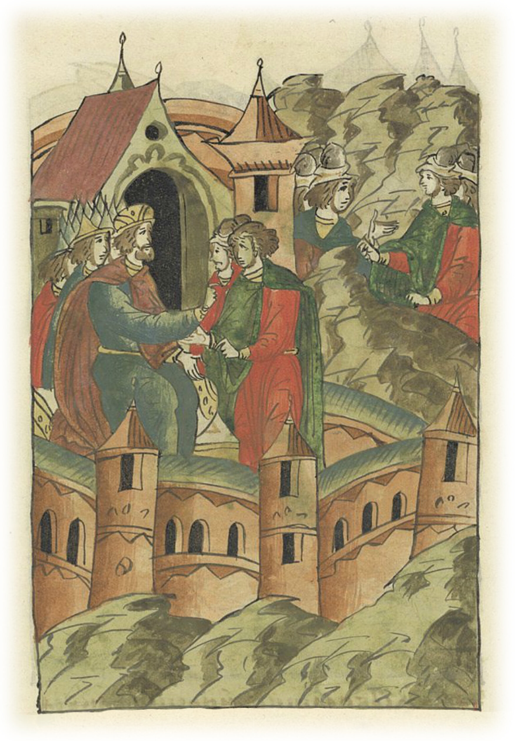 Ругодивские посадники Яким и Захар приезжают в Москву. Воеводы царя Ивана Васильевича Алексей Адашев и Иван Михайлов сообщают им, что государь пожалует их, если сдадут его воеводам помимо Ругодива Вышгород.