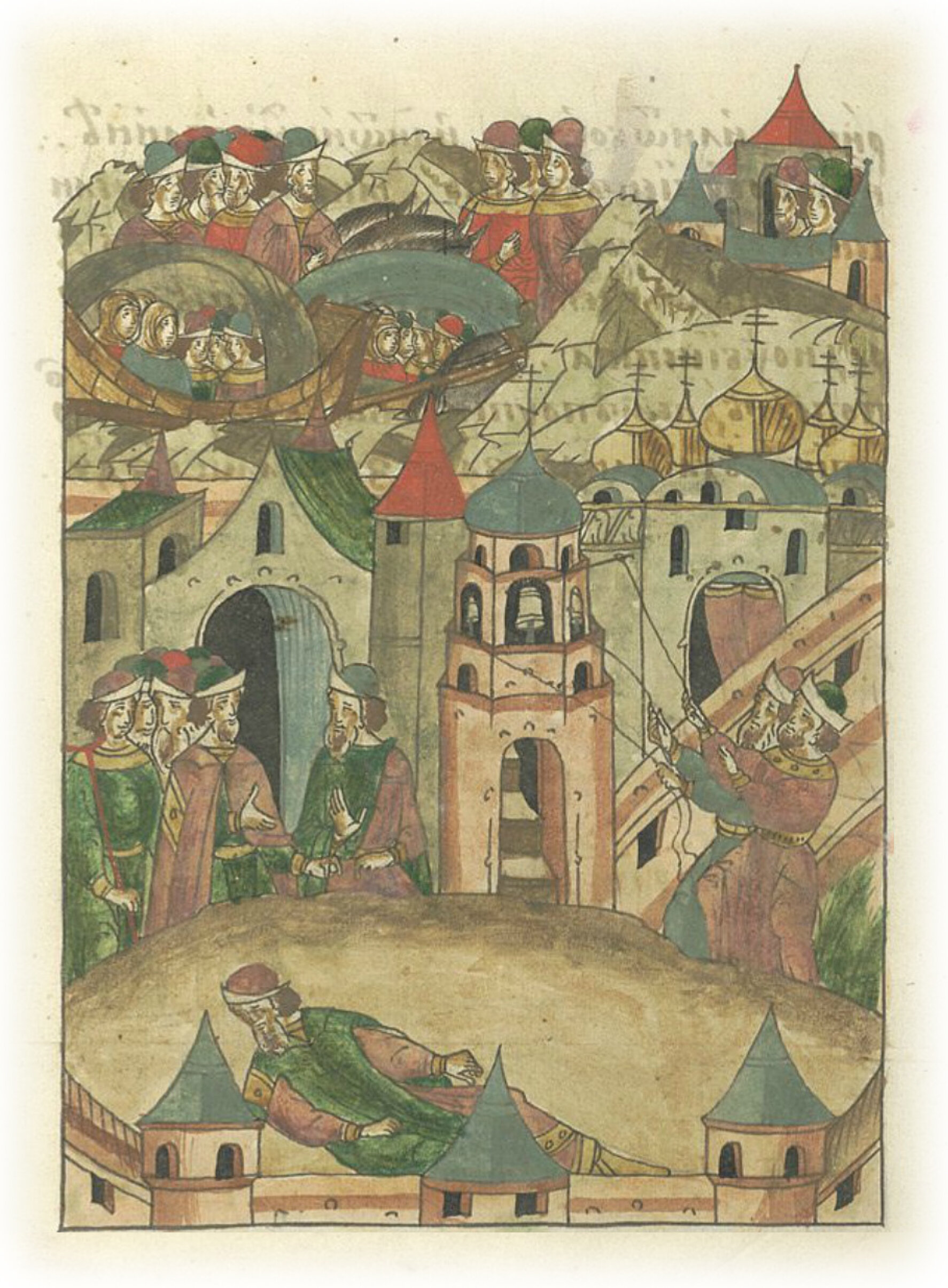 Той же зимой, месяца февраля в 3 день, в Москве ночью, когда заутреню благовестили, был убит московский тысяцкий Алексей Петрович. Убит был страшно, неведомо кем, неведомо как, только нашли его убитым на площади, когда заутреню благовестят. И некоторые говорили, что это сделано или по совету больших бояр или кем иным, тайком. Убит он был так же как великий князь Андрей Боголюбский Кучковичами. И был мятеж великий на Москве из-за того убийства. И той же зимой, по последнему пути большие бояре московские отъехали на Рязань с женами и детьми.