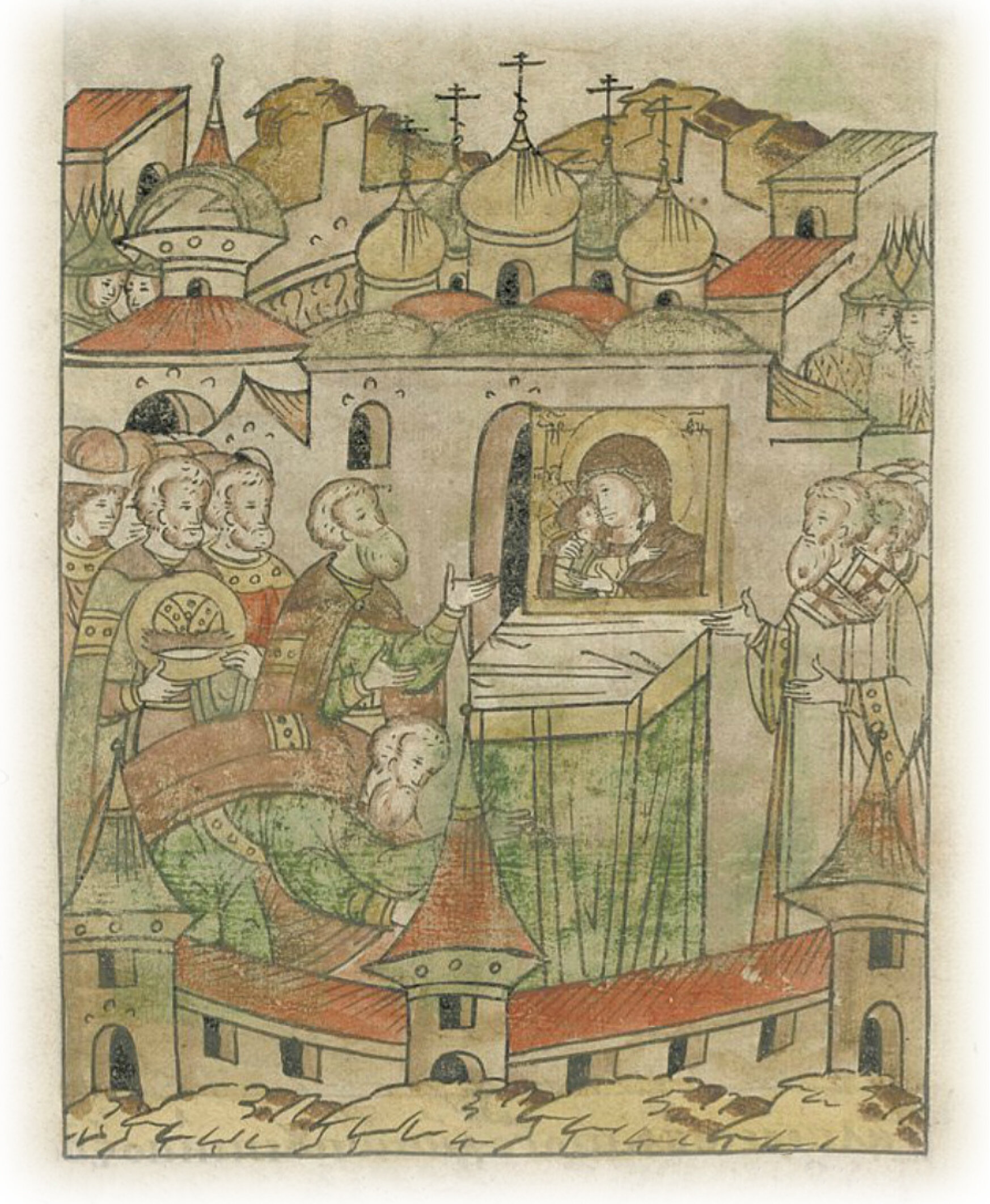 А сам великий князь вышел из царствующего города Москвы в августе в 15 день, прослушав божественную литургию на праздник соборной церкви пречистой Богородицы и пев молебен, припал к образу Спаса Вседержителя, и со слезами молясь, пречистую Его матерь на помощь призывая, говорил: «Многомилостивый и всещедрый человеколюбивый Исус Христос, Сын Божий, надежда моя и избавитель! Взгляни на обидящих и насилующих достояние Твое, восстань, Господи, помоги нам и не допусти безбожным и окаянным врагам нашим поглотить нас: ибо Ты, Бог наш; кроме Тебя, иного Бога не знаем, и только к имени Твоему обращаемся, и от Тебя все просим помощи; не оставь меня, Господи Боже мой, молитвами пречистой Твоей матери приснодевы Богородицы и святых Твоих угодников!»