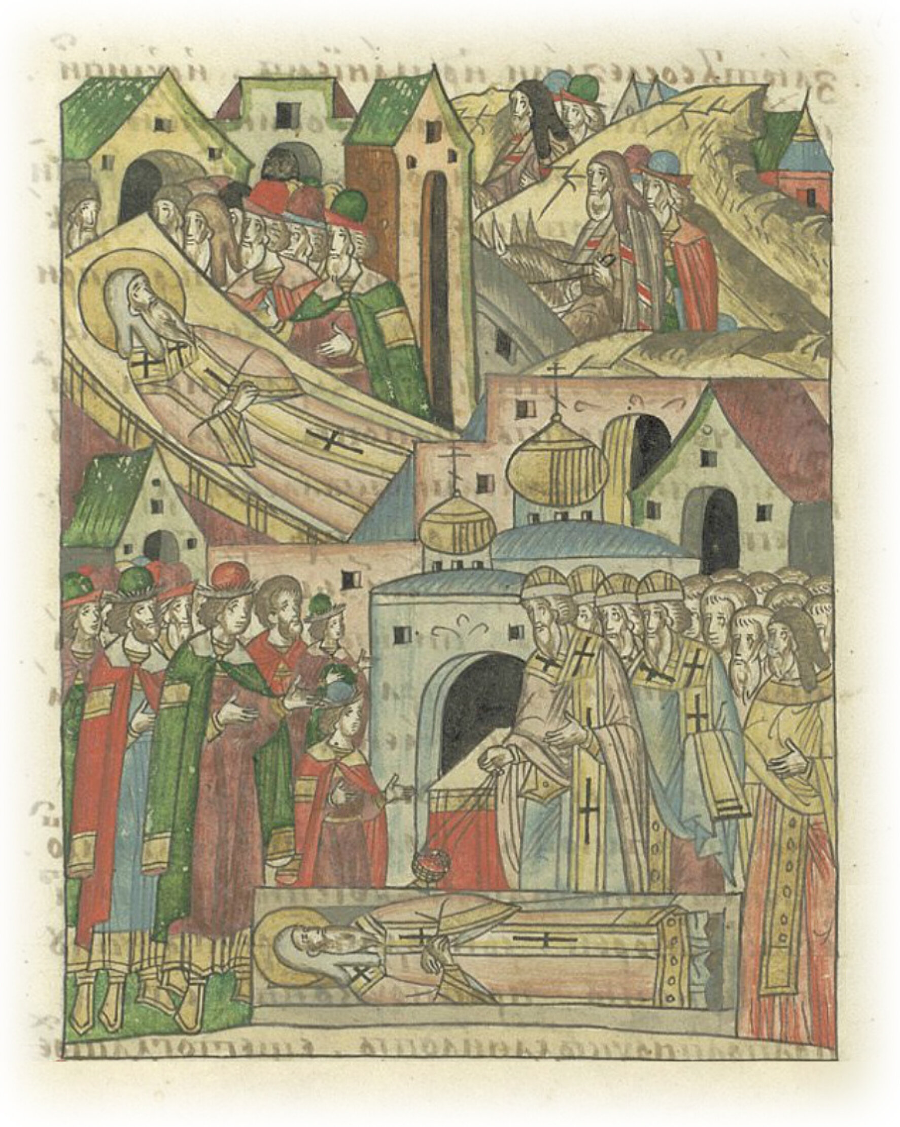 И едва дал последнее целование, отошел ко Господу в бесконечную жизнь месяца февраля в 12 день, в пятницу, во время церковной службы. Повелел святой положить себя не в церкви, а вне церкви за алтарем, указал место своего погребения и там повелел себя похоронить по своему великому смирению. Услышав о его преставлении, собрались князья, вельможи, иноки и епископы со слезами и рыданием. Удивился великий князь смирению святителя и, посоветовавшись с епископами, повелел похоронить его в церкви в приделе Благовещения Пречистой Богородицы, где и поныне от его честных мощей приходящие с верою получают исцеление. Присутствовали на его погребении великий князь Дмитрий Иванович, внук Иванов, правнук Даниилов, праправнук Александров, препраправнук Ярослава; его двоюродный брат князь Владимир, сын Андреев, внук Иванов, правнук Даниилов, праправнук Александров; князь Василий, сын великого князя Дмитрия, внук Иванов, правнук Иванов, праправнук Даниилов, которому в то время было шесть лет; его брат князь Юрий, сын Дмитриев, внук Иванов, правнук Иванов, праправнук Даниилов, которому было тогда три года. Ушел из мира блаженный Алексий с горячим желанием с любовью трудиться Господу в 20 лет или чуть больше, постригся в святой ангельский иноческий чин в Богоявленском монастыре; прожил в монастыре довольно долго. Потом митрополит Феогност взял его к себе на двор, пробыл святитель его наместником 12 лет и три месяца, еще при своей жизни митрополит Феогност поставил святого Алексия в епископы Владимира, и пробыл тот епископом 4 года. После преставления Феогноста в Царьграде был поставлен блаженным патриархом Филофеем в митрополиты, было ему тогда 60 лет, в сане митрополита пробыл 24 года, всего прожил он 85 лет, и был в том гробе 60 лет.