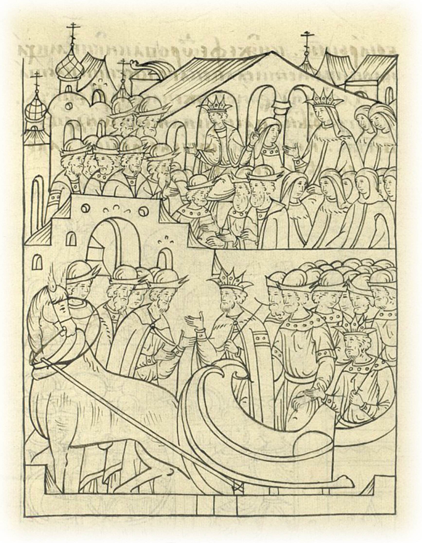 И как царь приехал на двор к великому князю, и князь великий велел царя почтить, встретить у саней боярину своему Василию Васильевичу Шуйскому да боярину и конюшему князю Ивану Федоровичу Телепневу, да дьякам Федору Мишурину да Меньшому Путятину. А великий государь сидел с матерью своей в палате у Лазаря святого, а у великой княгини сидели боярыни: князя Федора Михайловича Мстиславского княгиня Настасья да Алена, жена Ивана Андреевича, да Агрофена, жена Василия Андреевича, и иные многие боярыни; а бояре сидели по обе стороны.