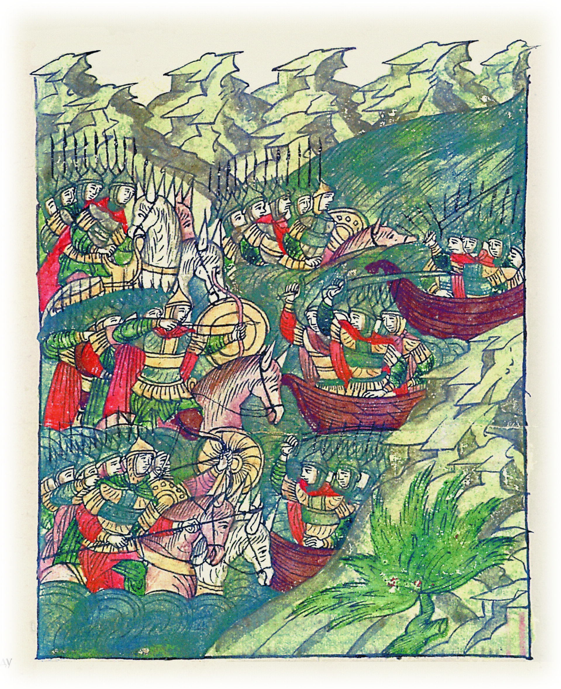 И так, ходя туда и сюда, пришли к Зарубу; застава же стояла там и не давала им перейти Днепр, и крепко бились с ними. Они же, словно взбесившиеся, сидя на конях в доспехах со щитами и копьями и стреляя, как демоны лукавые, одни вброд, другие вплавь стреляя; и так покрыли Днепр-реку множеством воинов.