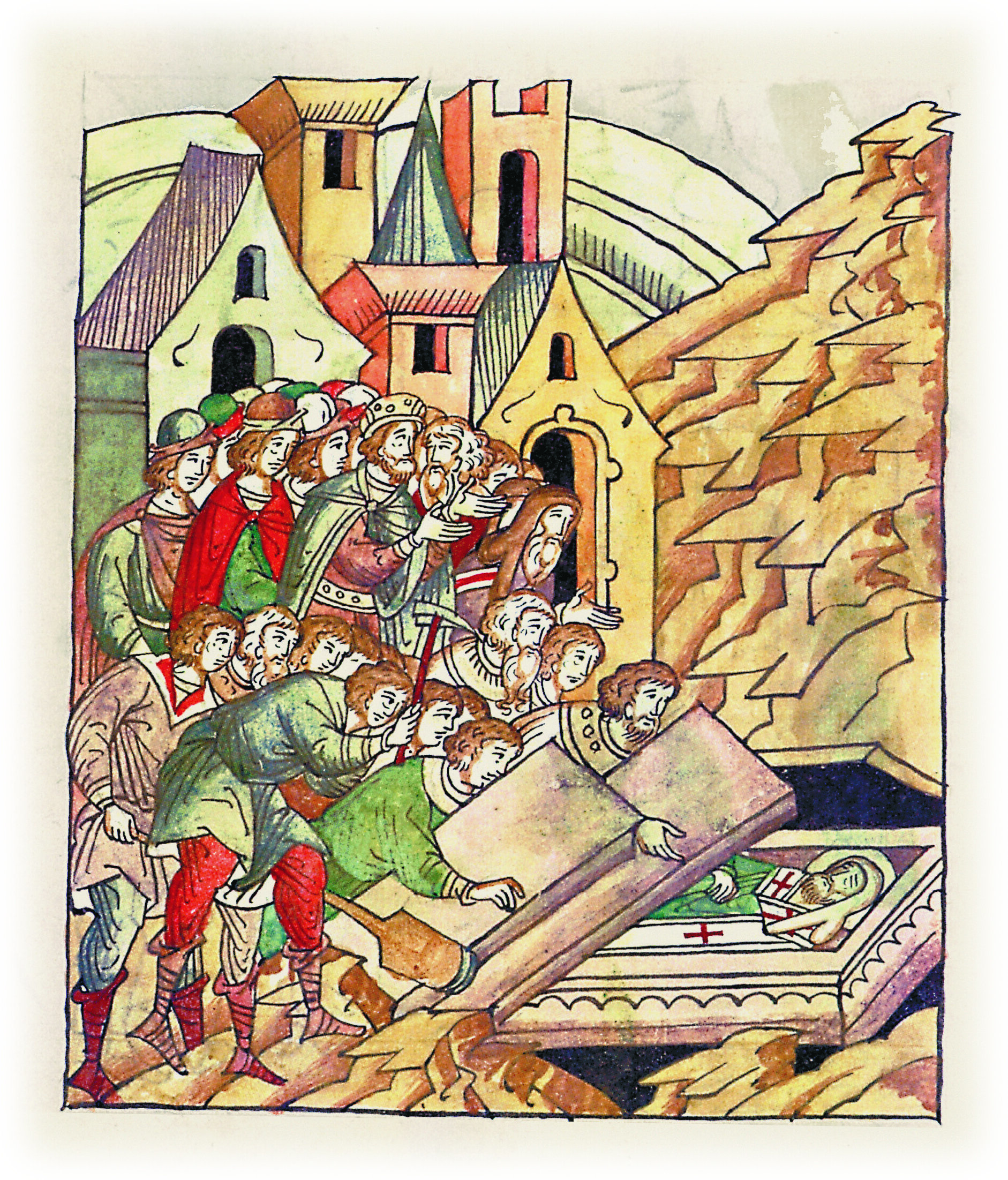 Также, копая у передней стены, нашли гроб, покрытый двумя досками, и, открыв, увидели в нем тело Леонтия, епископа Ростовского, чудотворца, ничем не поврежденное, но все целое и благоухание испускающее, и ризы его как новоположенные; и была радость в городе Ростове великая князю Андрею и всем людям.