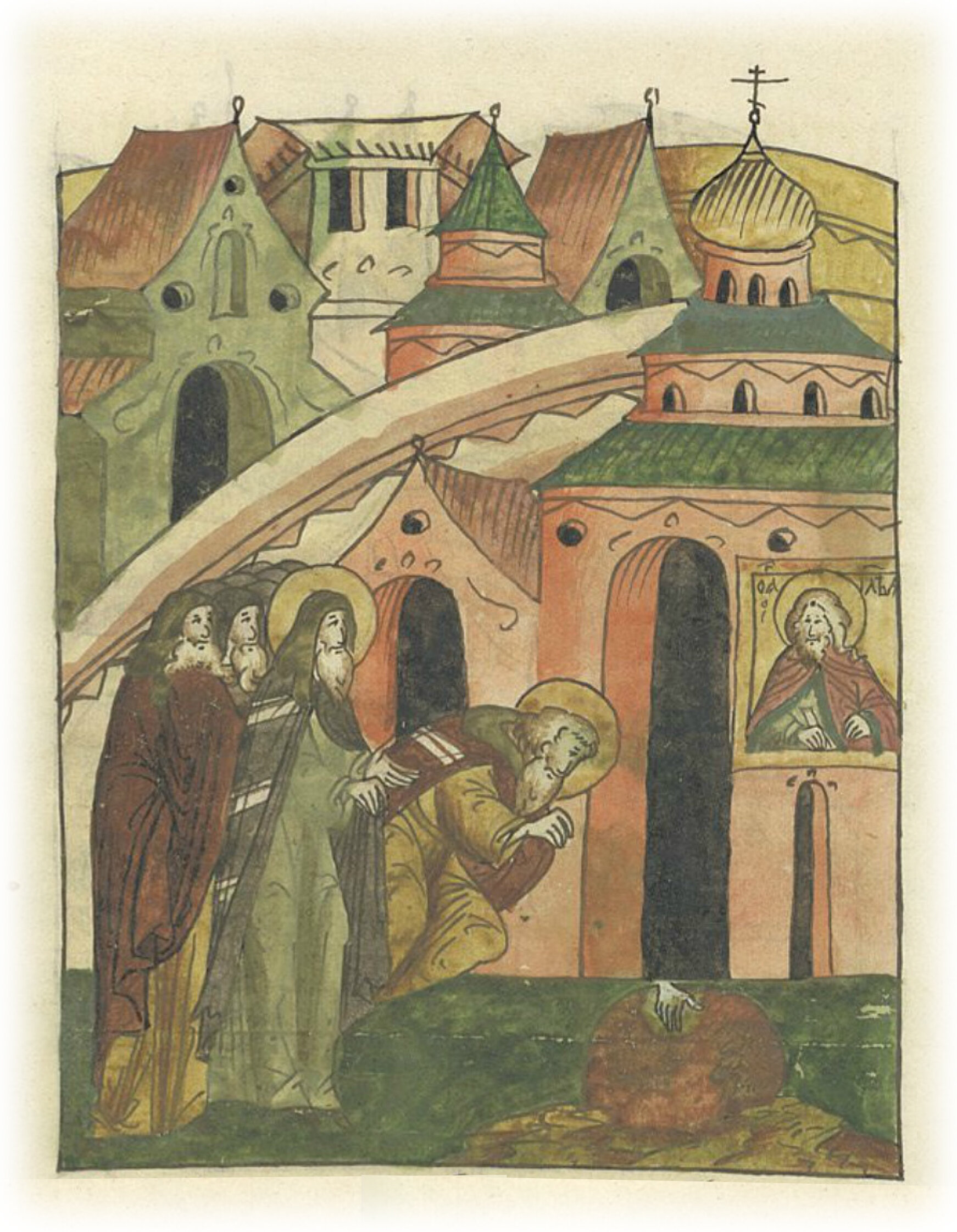 И побывал в церкви святого пророка Ильи, и поклонился тому месту, где Моисей видел Бога, на том камне и до сегодняшнего дня изображение державной десницы отмечает место нахождения Господа. И с радостью возвратился в монастырь Пречистой Богородицы, и пробыл в нем всю Четыредесятницу.