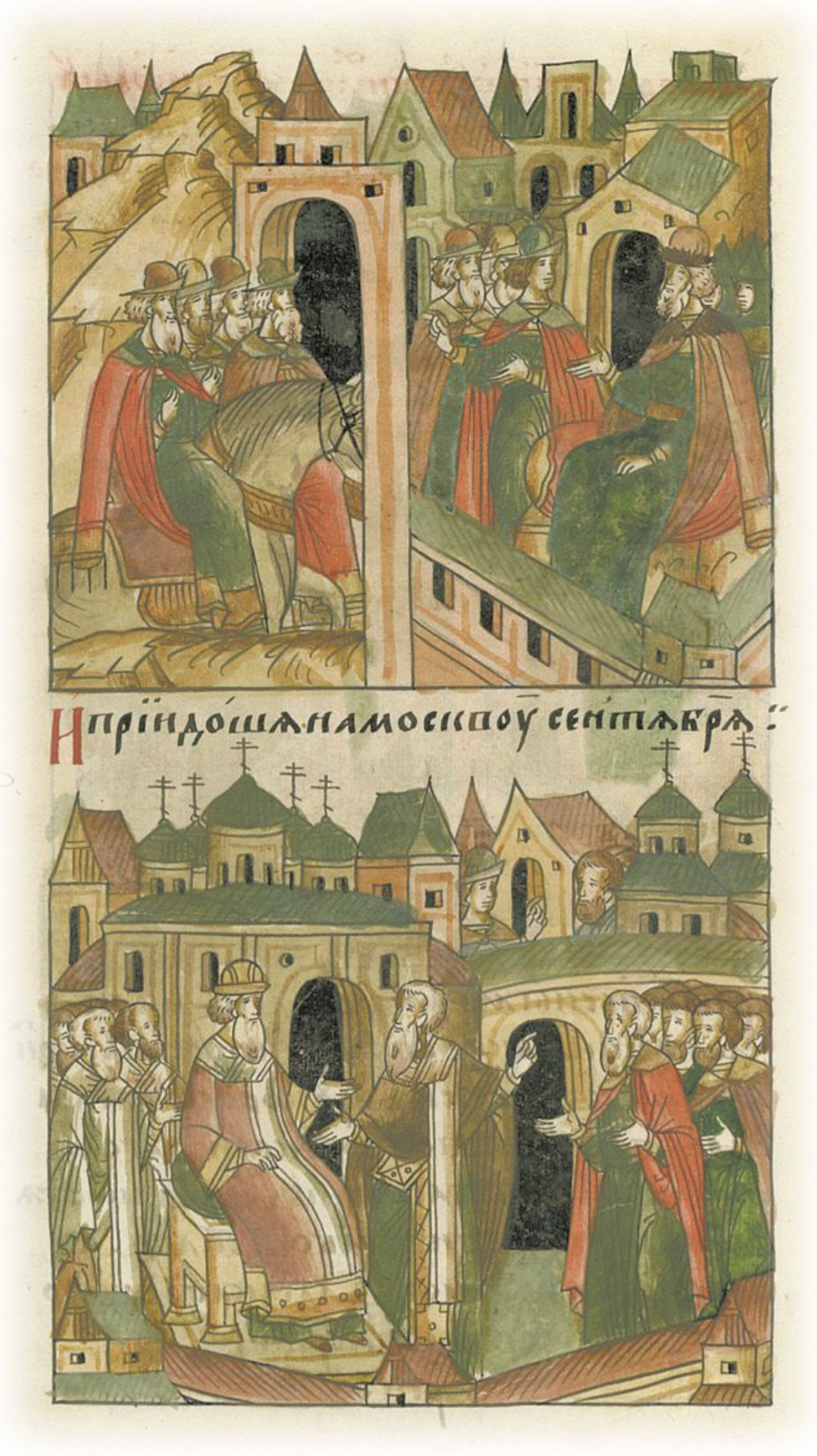 и пришли они в Москву в (месяце) сентябре. О соборовании, о вдовицах, о попах и дьяконах. В том же году был архиепископ Новгородский Геннадий в Москве, и совещался он с Симоном, митрополитом всея Руси, и с епископами, и повелели вдовым попам и дьяконам не петь, не касаться священнодействия,