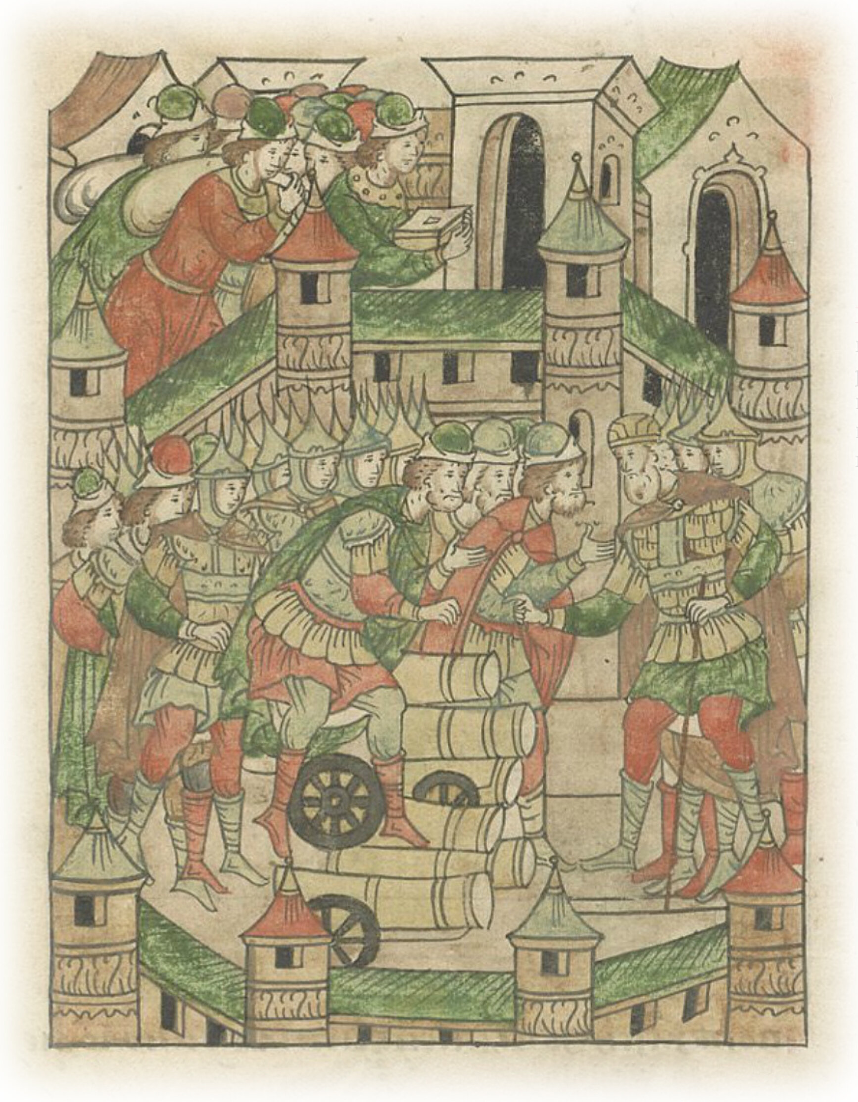 И, уходя, повелел великий князь воеводам городским расставить в городе пушки и пищали и городским людям имущество возить за стены города.