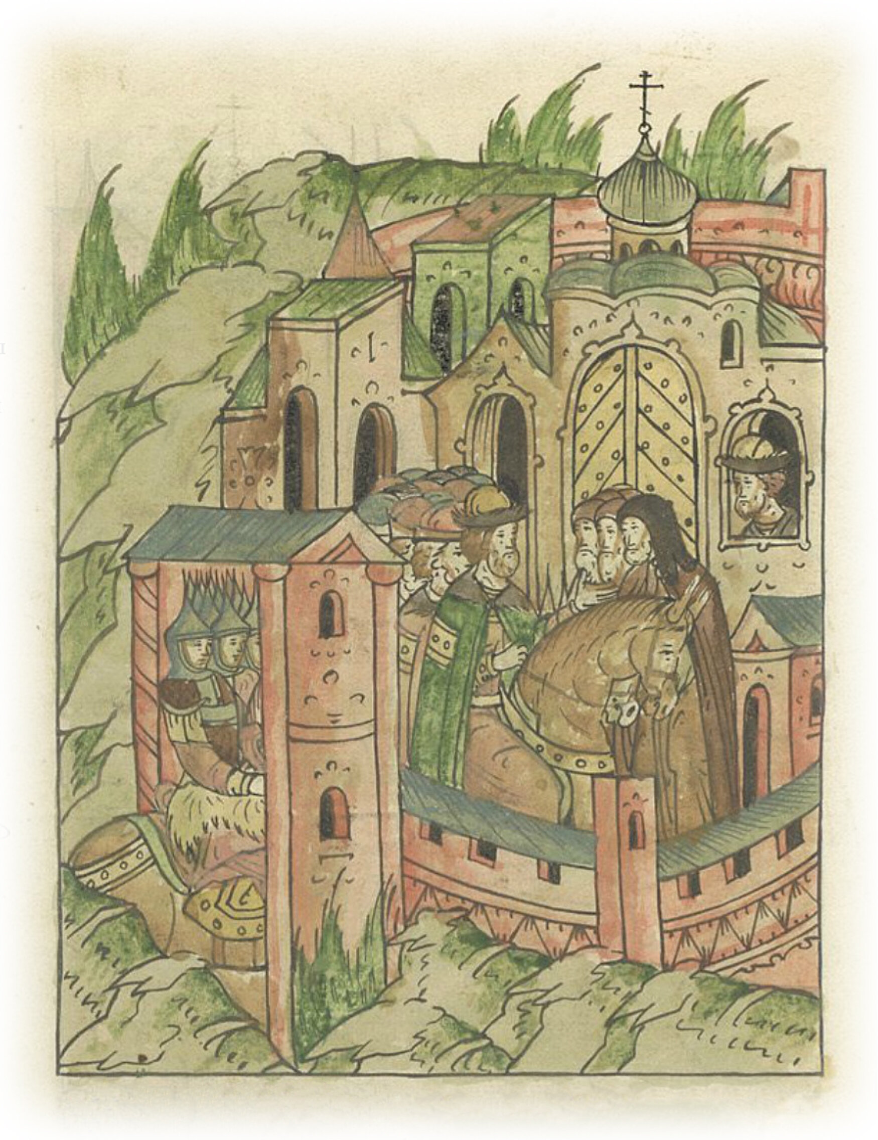 Потом и сам князь Иван прискакал в монастырь и все воинство их. И начал спрашивать князь Иван – где великий князь. Великий же князь внутри церкви услышал голос князя Ивана и закричал очень громко: «Брат, помилуй меня! Не лишай меня возможности видеть образ Божий и пречистую матерь Его, и всех святых Его, а я не выйду из монастыря сего и волосы урежу* здесь». * приму постриг.