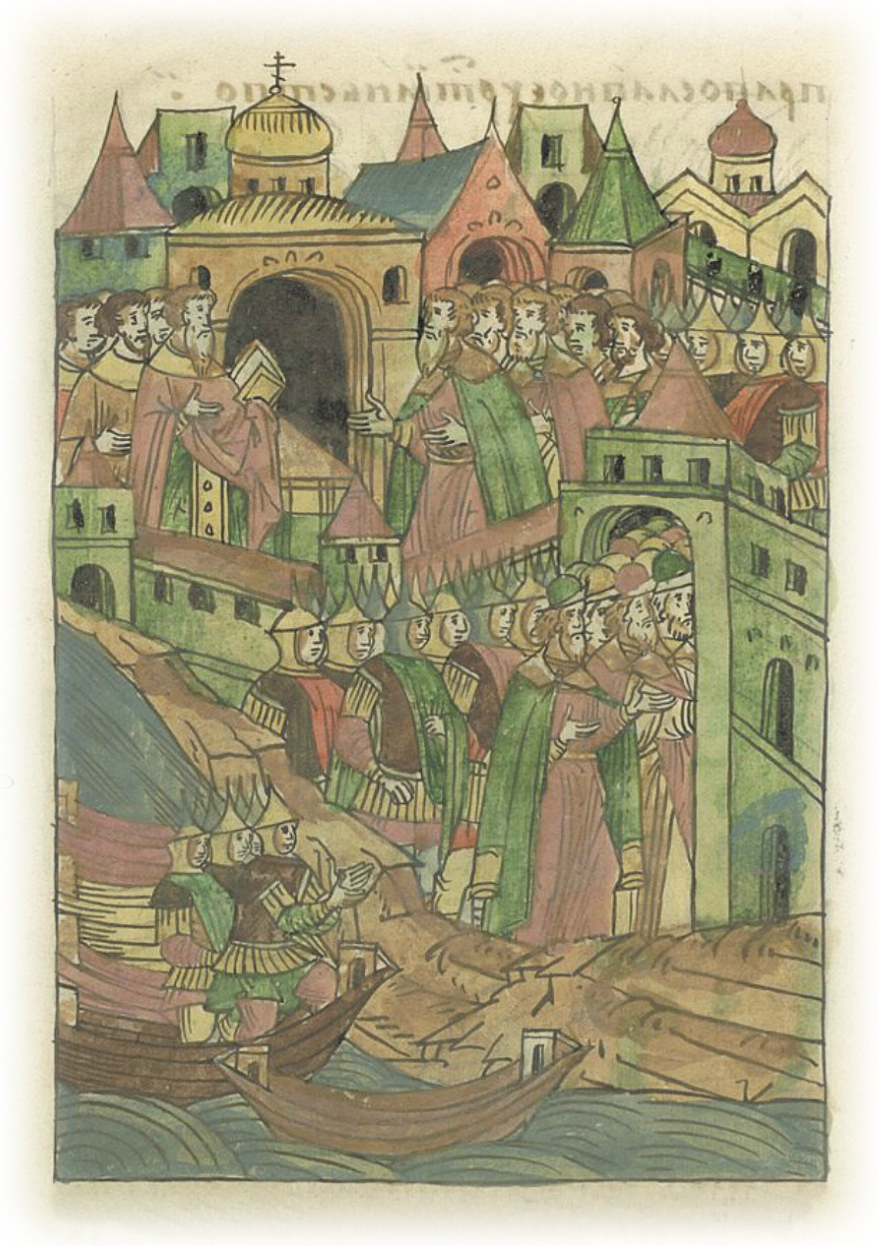 и, выйдя из судов, пошли в город к старой церкви Преображения Господня, и повелели бывшим там священникам молебен совершить за великого князя и за воинов его.