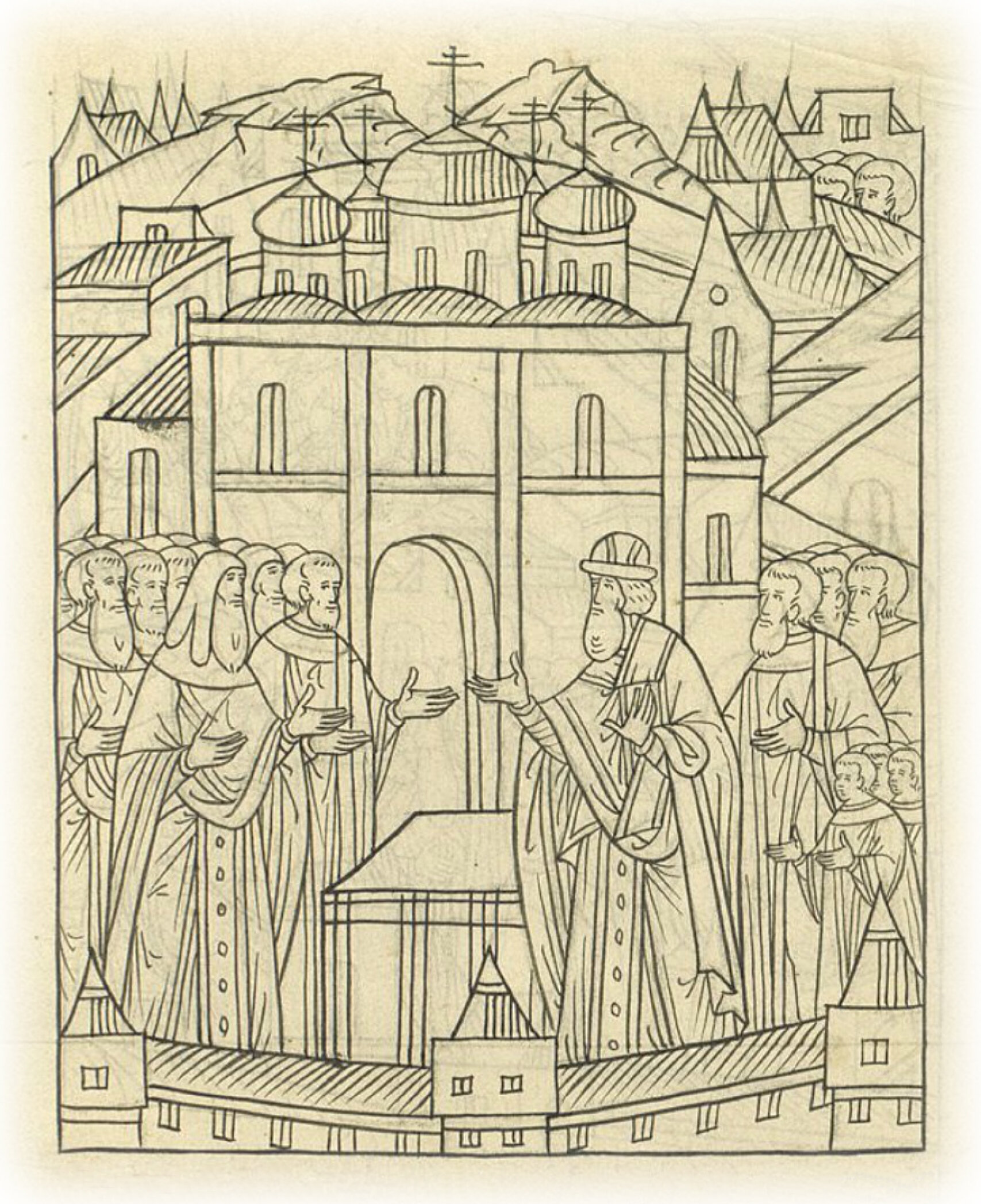 И служил в (церкви) Софии Премудрости Божией первую обедню на Николин день; и с того дня явил Бог милосердие свое, прекратилось поветрие. Текст приписки скорописью на полях рукописи: И бояре начали князю Владимиру Андреевичу говорить, чтобы князь не упрямился, государя бы послушал и крест бы целовал; а говорил сначала князь Владимир Воротынский, да дьяк Иван Михайлов. И князь Владимир Андреевич начал кручиниться очень, а Воротынскому сказал: «Ты бы на меня не бранился, не указывал бы мне ничего и против меня не говорил». И Воротынский отвечал князю: «Я, государь, дал душу государю своему и великому князю Ивану Васильевичу всея Руси и сыну его царевичу князю Дмитрию, что мне служить им во всем честно. И с тобой мне они, государи мои, велели говорить, и служу я им, государям своим, а тебе служить не хочу; и за них, государей своих, с тобою говорил. А если придется, по их государей велению и драться с тобой готов». Начали и иные бояре говорить, чтобы князь целовал (крест), а не будет князь крест целовать, и ему оттуда не выйти. И едва удалось принудить князя Владимира крест целовать, и целовал крест поневоле. И после того посылал государь к княгине Ефросинье с грамотой целовальной, чтобы велела к той грамоте привесить печать княжью, боярина своего князя Дмитрия Федоровича Палецкого, да дьяка своего Ивана Михайлова; и они к княгине ходили трижды, и она нехотя велела печать приложить, и говорила: «Что это за целование, если невольное?» И много речей бранных говорила. И с того времени началась вражда большая у государя с князем Владимиром Андреевичем, а в боярах смута и мятеж, а царству началась во всем скудость.