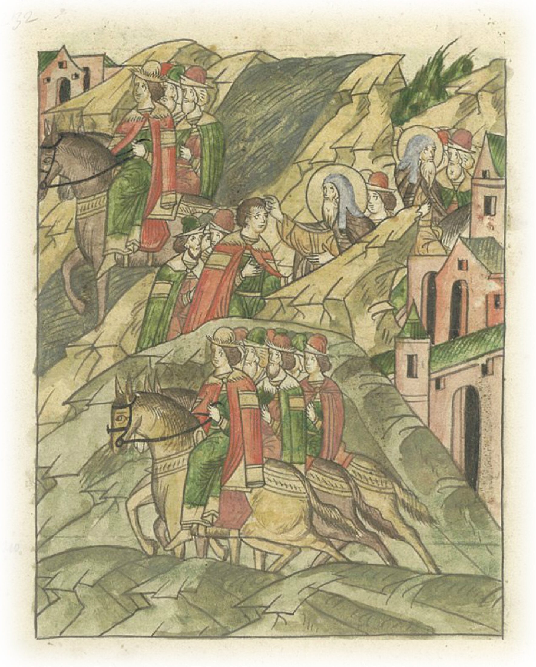 Великий князь Дмитрий Иванович с князем Андреем Ростовским идет в Орду. Митрополит Алексий провожает их до реки Оки.