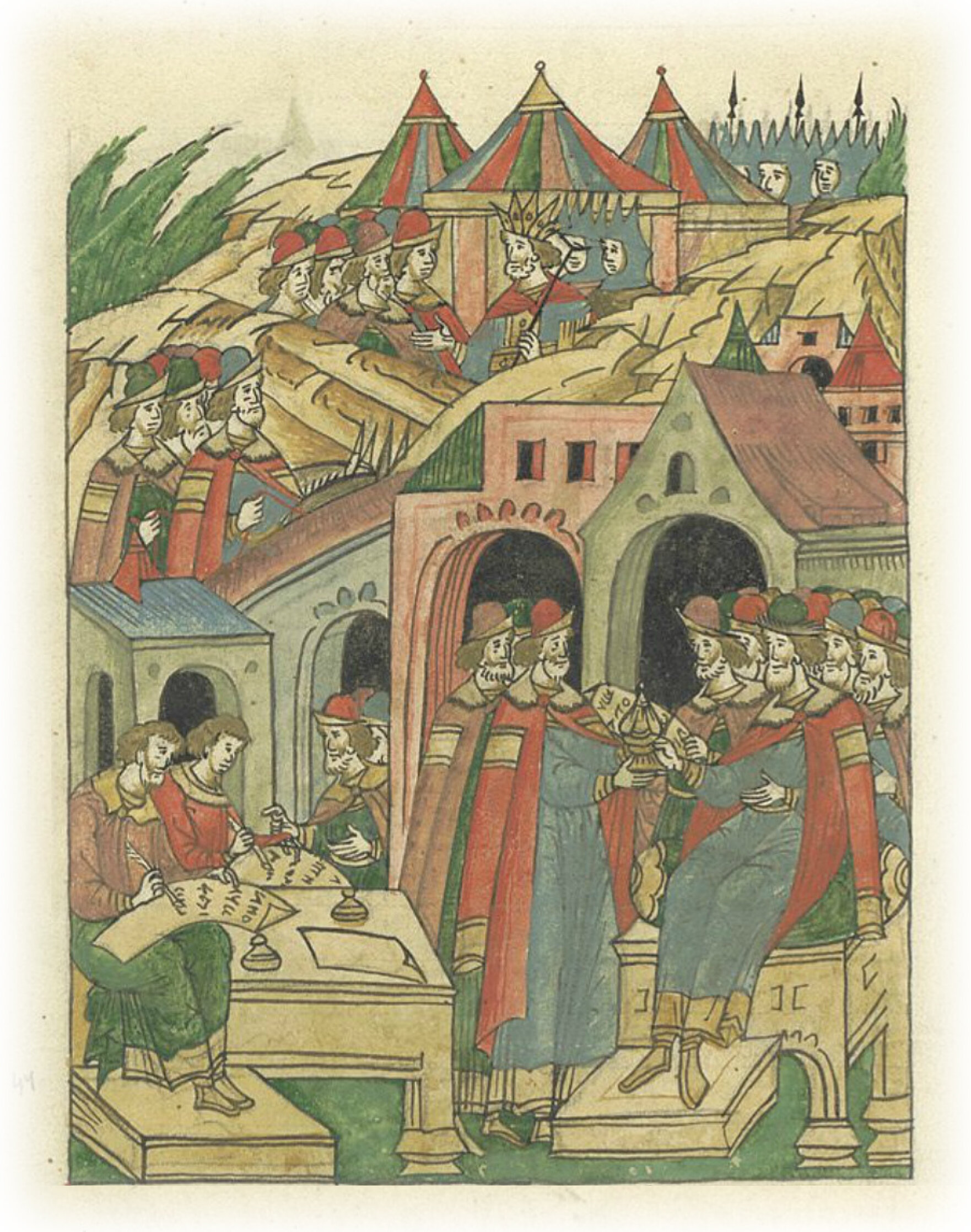 И послал Олег, князь Рязанский, посла своего к царю Мамаю нечестивому с великою честью и с дарами многими, и ярлыки многие свои написал к нему такие: