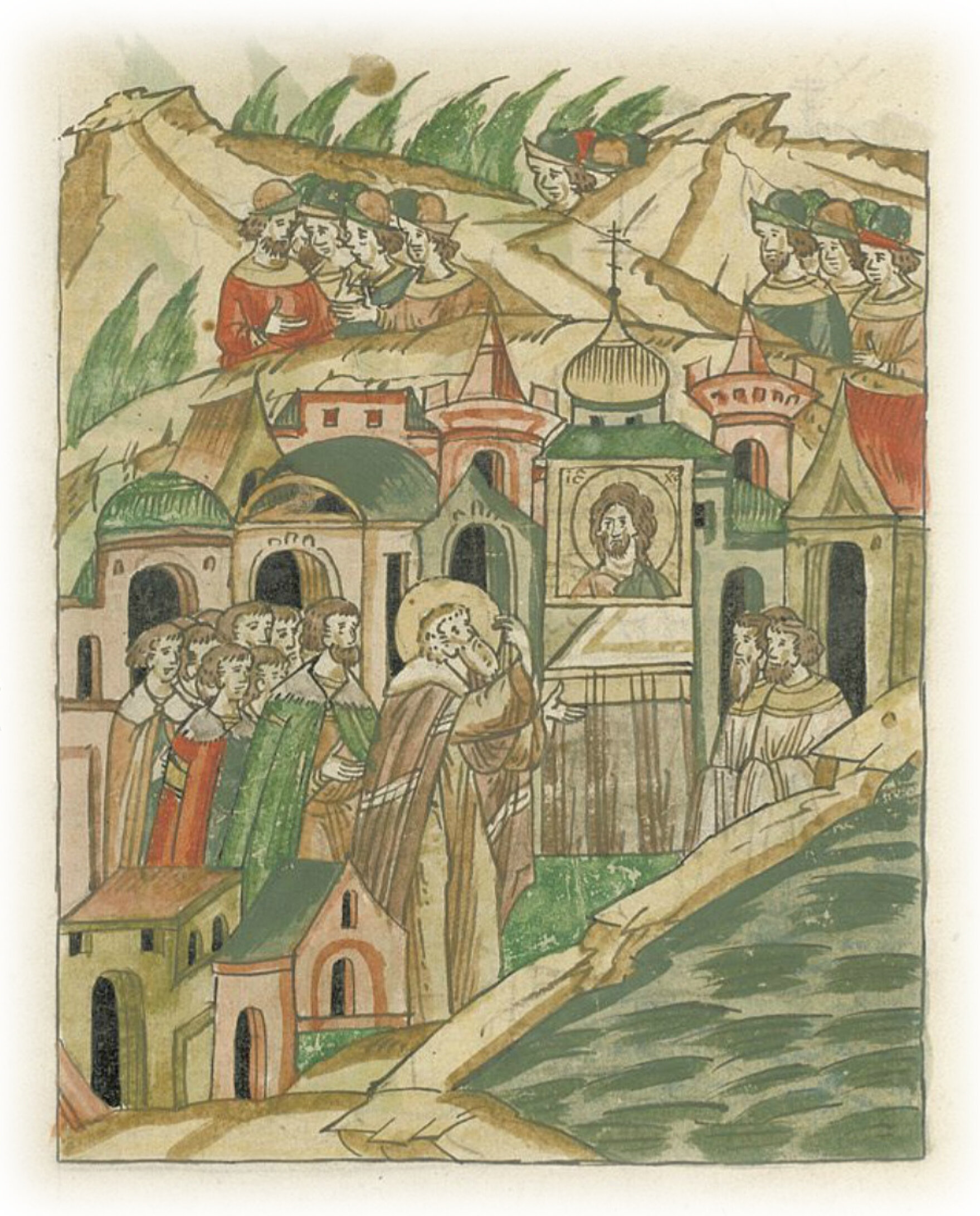 Митрополит же, войдя в посад города того, пошел к соборной церкви Преображения Господа Бога и Спаса нашего Исуса Христа; была же церковь та на посаде, на поле у озера.