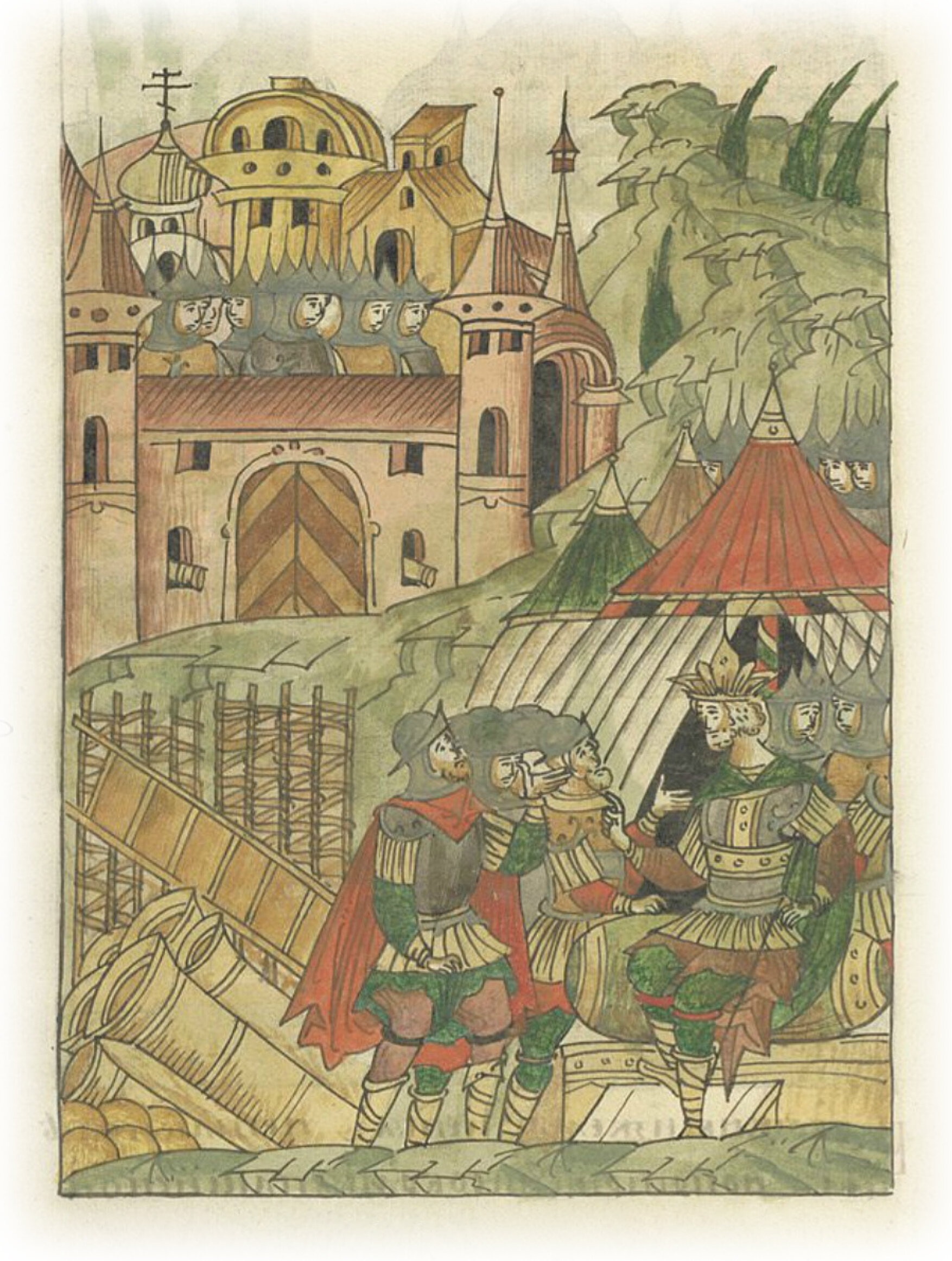 Языки говорят воеводам царя Ивана Васильевича, что магистр окопался большим рвом вокруг города Рындола, бьет из пушек и пищалей и приступает к Рындолу.