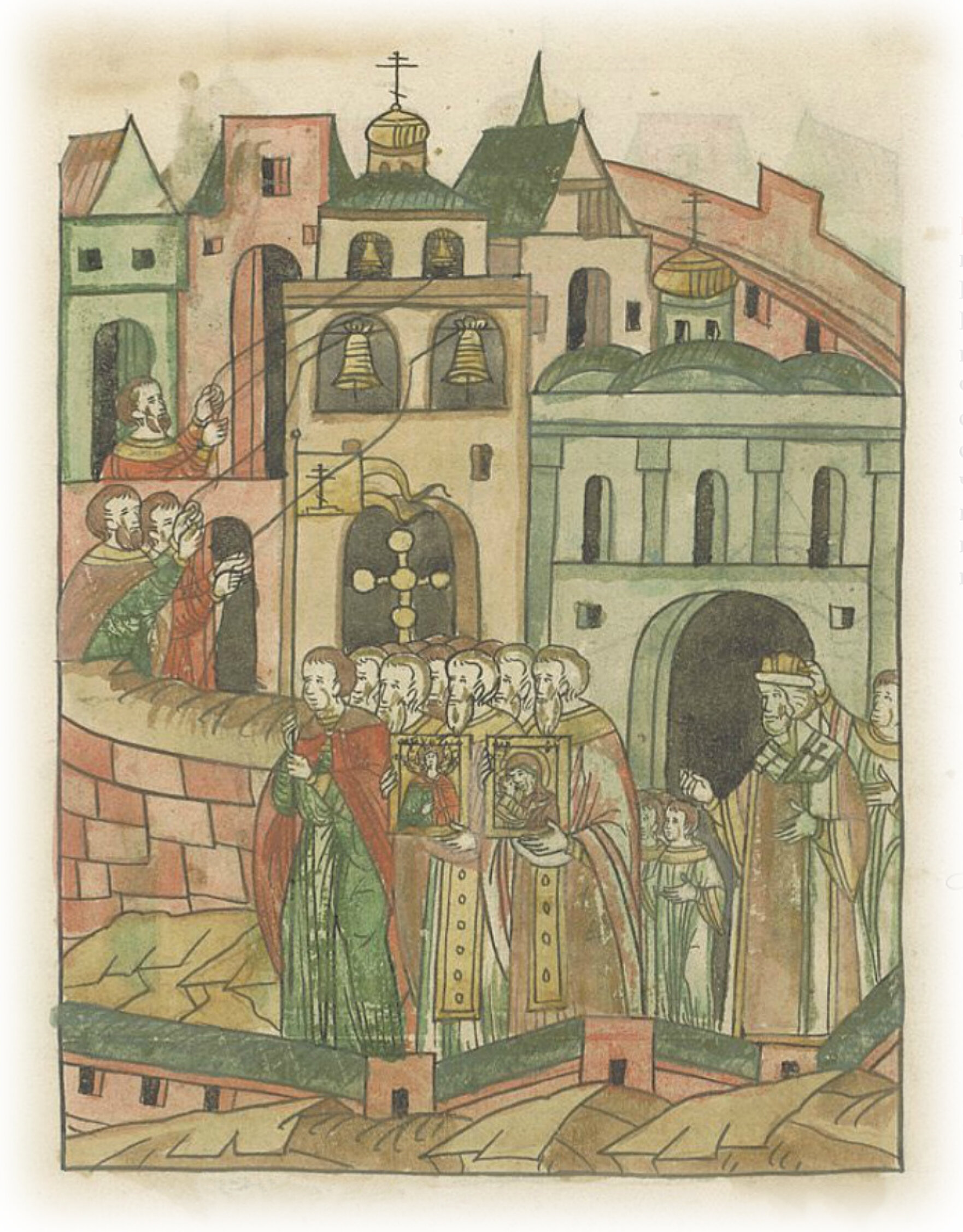 Создание соборной церкви Успения пресвятой Богородицы в Москве митрополитом всея Руси Филиппом. Митрополит со всем освященным собором идет на основание церкви и велит звонить в колокола.