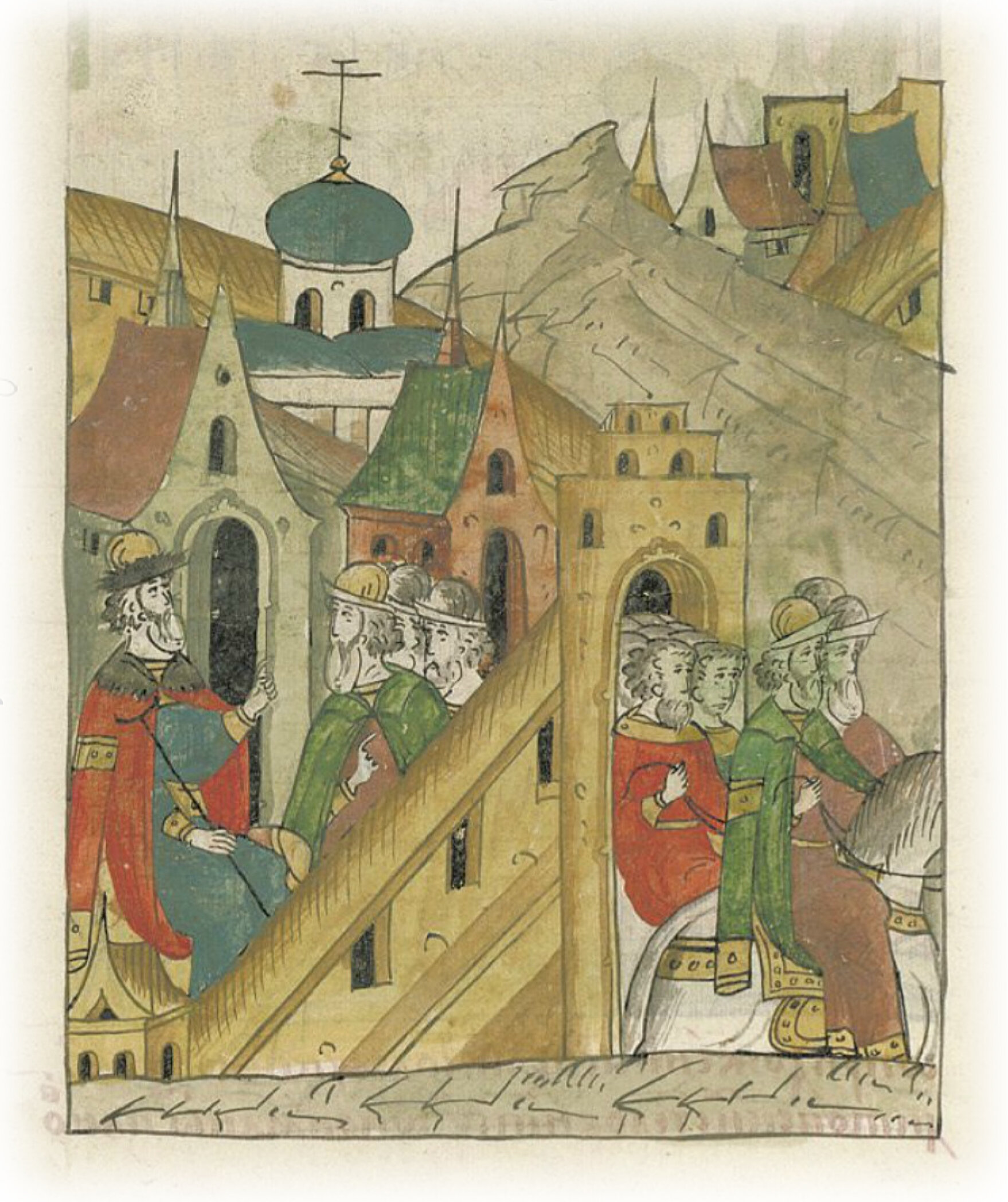 Ругодивские посадники Яким и Захар приезжают в Москву. Воеводы царя Ивана Васильевича Алексей Адашев и Иван Михайлов сообщают им, что государь пожалует их, если сдадут его воеводам помимо Ругодива Вышгород.