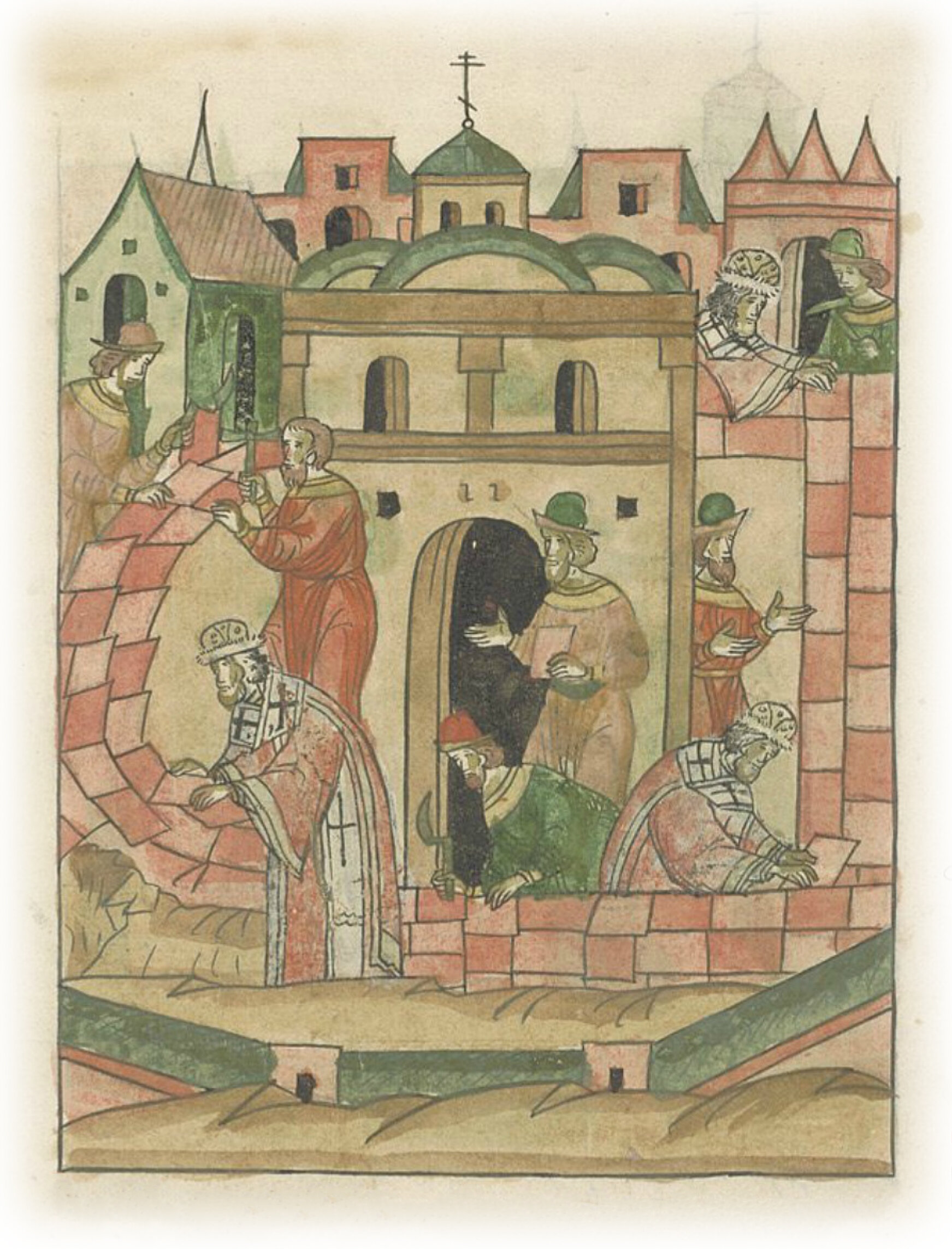 и прежде всех своими руками митрополит начало полагает, где алтарю быть, также по сторонам и по углам, и после того мастера начинают строительство здания. Заложена же была эта церковь после заложения прежней церкви, которую заложил преосвященный митрополит Петр при князе Даниле Ивановиче 146 лет без трех месяцев тому назад.
