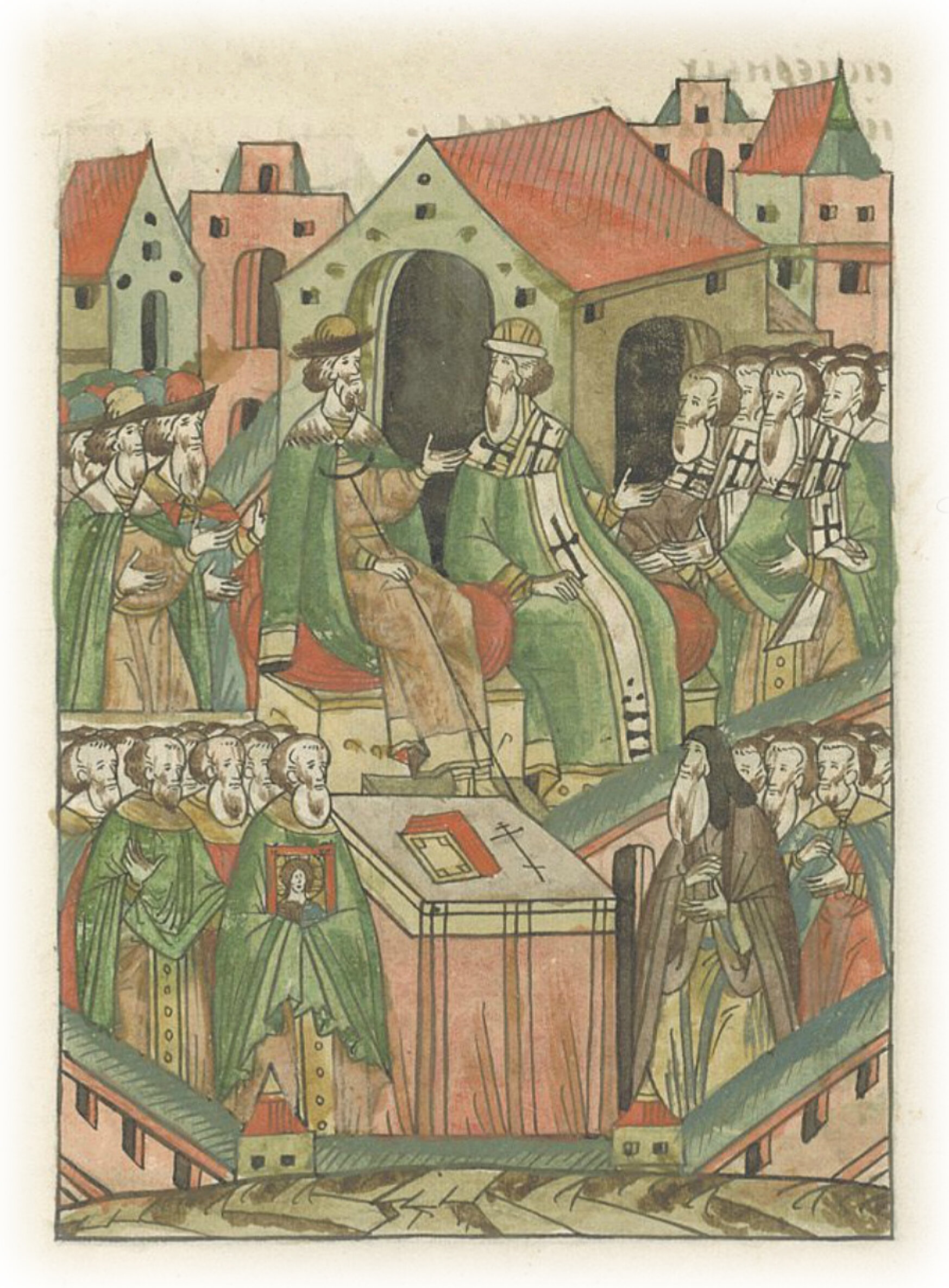 И стояли они словно в исступлении ума, как немые, на соборе перед великим князем, митрополитом, перед архиепископом и перед епископами, и перед всем освященным собором Русской митрополии, в тех своих ересях заперлись, в своих скверных делах, и находились как в исступлении ума.